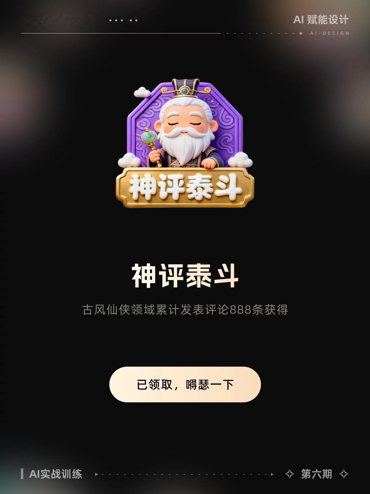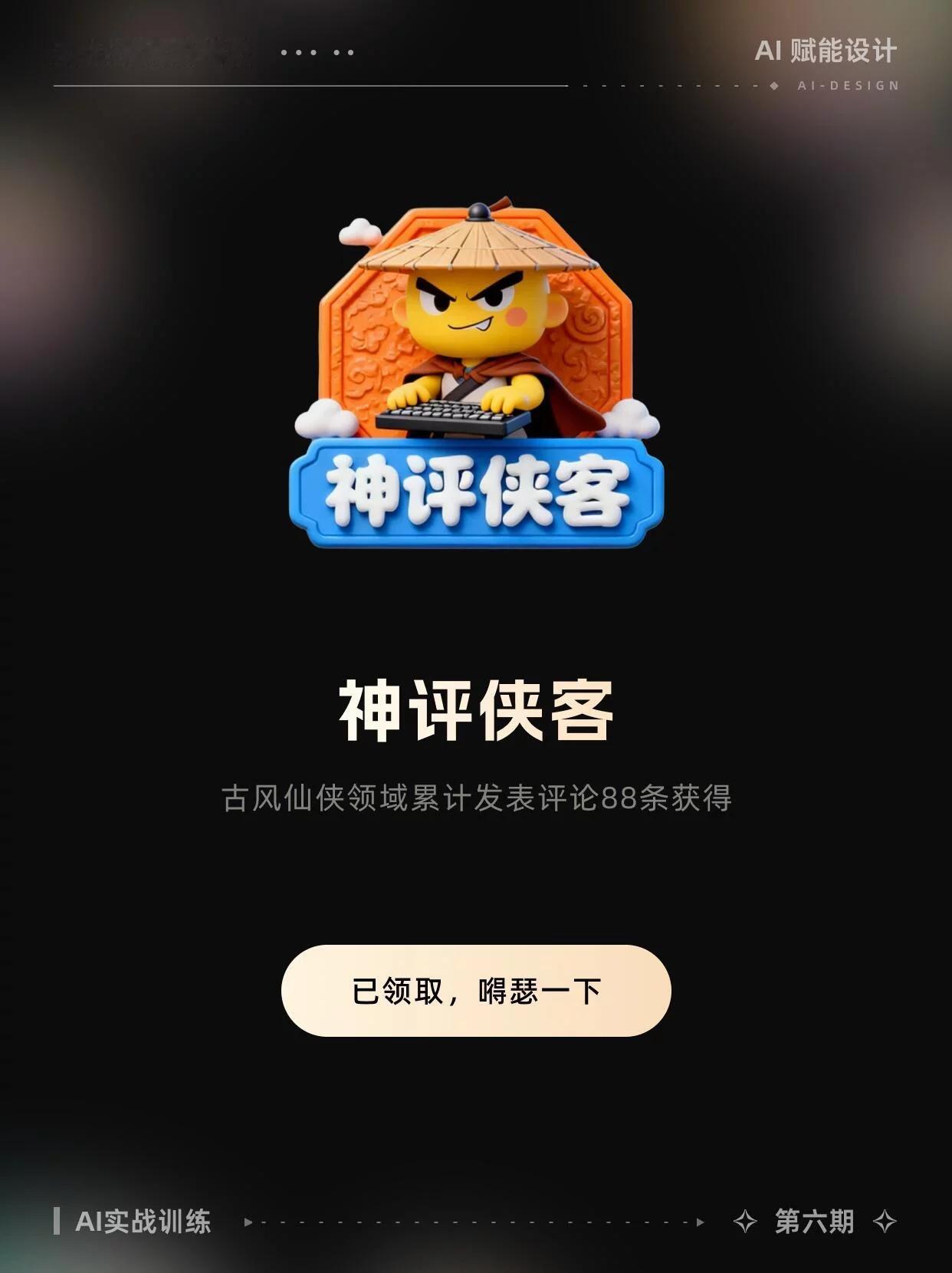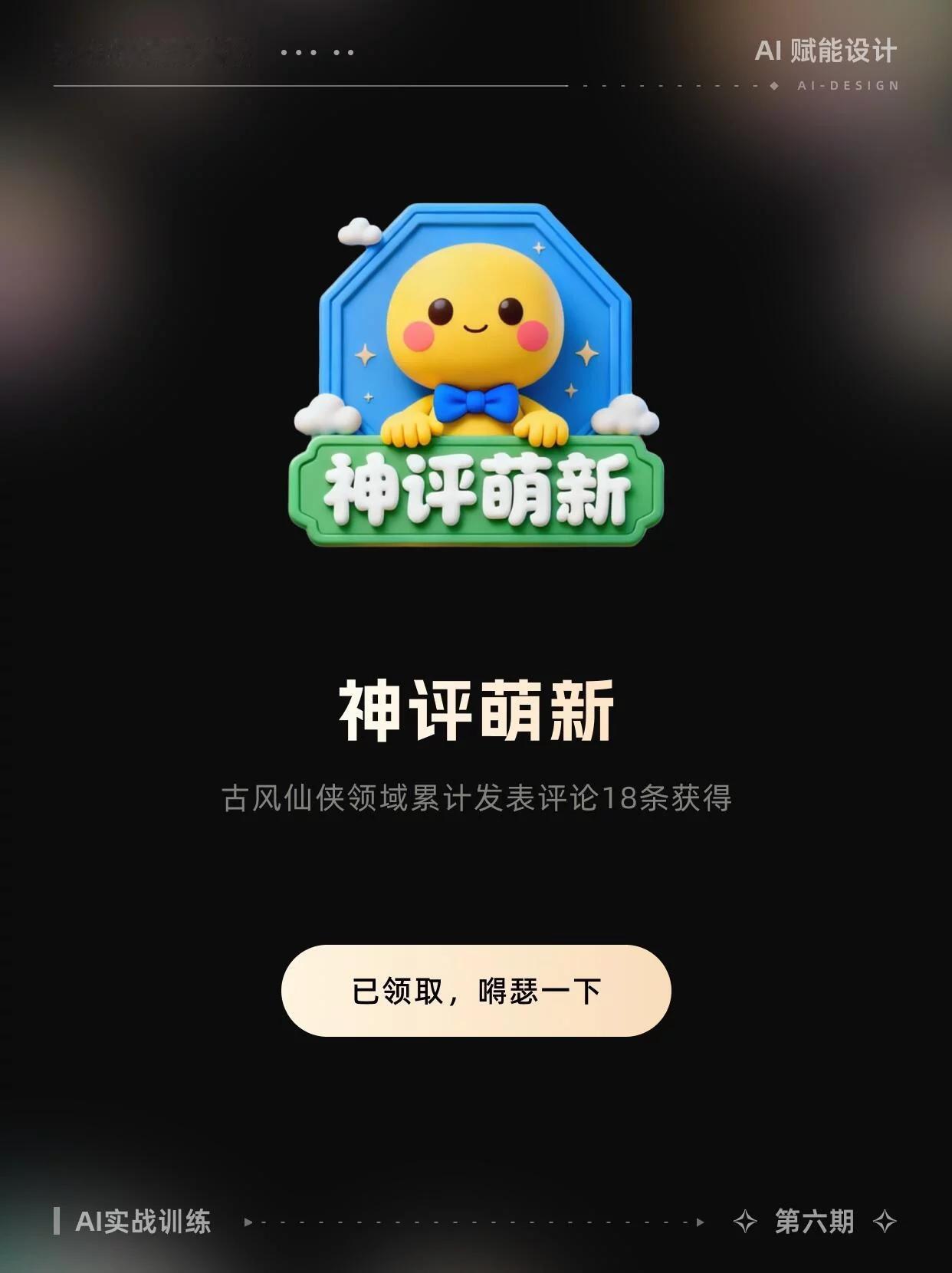 ai创造营 AI给我灵感!解锁勋章设计的1001种可能(附提示词)AI 在风格探索阶段具有无可比拟的优势,能在短时间内提供大量视觉方向,极大拓宽了设计可能性。我已经替大家进行了一次勋章风格探索实验了。🎯 实验目标:用AI快速探索不同艺术风格的勋章设计🔧 实验方法:通过切换风格关键词,生成多样化方案:1️⃣ 卡通3D风:卡通 3D 立体图标,色彩清新柔和,三个卡通立体勋章,主体都是风格相同的黄色拟人化表情符号:第一个神态懵懂好奇,戴着蓝色领结,小手平放在前面,脸颊带腮红,蓝色六变形外框,周围点缀小云朵和细碎星光,绿色矩形底框,白色卡通加粗字体“神评萌新”,字体卡通醒目,笔触圆润,光影柔和,充满新手的天真感;第二个神态英气,嘴角邪魅上扬,武侠风融合趣味感,手拿键盘头戴斗笠(斗笠极小迷你,手小,头大),身披棕色短披风,橙色带纹理凸起的六边形外框,周围点缀小云朵和细碎星光,蓝色矩形底框,白色卡通加粗字体 “神评侠客” ,字体卡通醒目,笔触圆润,光影柔和,整体保留圆润质感与立体光影,强化武侠元素的灵动性;第三个神态睿智从容,白发白胡须,双眼微眯,不要出现耳朵,手持玉如意,头顶有复古官帽装饰(帽子极小迷你),紫色带祥云纹理的六边形外框,周围点缀小云朵和细碎星光,金色矩形底框,白色卡通加粗字体 “神评泰斗” ,字体卡通醒目,笔触圆润,光影柔和,整体光影细腻有层次,元素凸显泰斗的资深与智慧感。2️⃣ 金属立体风:一个银色金属立体等级徽章,带有小翅膀的六边圆角形的徽章,中间有一颗两个叶子的绿色嫩芽,背后小英文"Hello World",下方丝带标注 “编程初探” 立体字,漫射光,整体风格简约却不失科技感,渐变质感,线条柔和无尖锐棱角,高清细节3️⃣ 梦幻精灵风:成就勋章设计,由花朵、藤蔓融合而成的可爱拟人表情,头顶绽放发光花苞,长着可爱小翅膀,45°飞翔姿势,绚丽磨砂玻璃质感勋章背景框,周围漂浮这发光物,和飘落的花瓣,奇幻卡通童话风,生物拟态 + 梦幻元素,色彩明亮丰富,整体色彩梦幻柔和,充满童话秘境的奇幻感,黑色背景4️⃣ 蒸汽波复古风:蒸汽波复古风潮评玩家勋章设计,像素化的复古笑脸符号,身穿霓虹格纹复古运动服,手持老式对讲机,复古八边形形状背景外框,内部闪烁着 VHS 故障纹理和彩色光斑,蒸汽波复古风,复古元素 + 迷幻色彩,整体色彩迷幻冲突,充满复古未来主义的荒诞创意,黑色背景案例虽少,但是万变不离其宗,相信聪明的你一定能学会。
