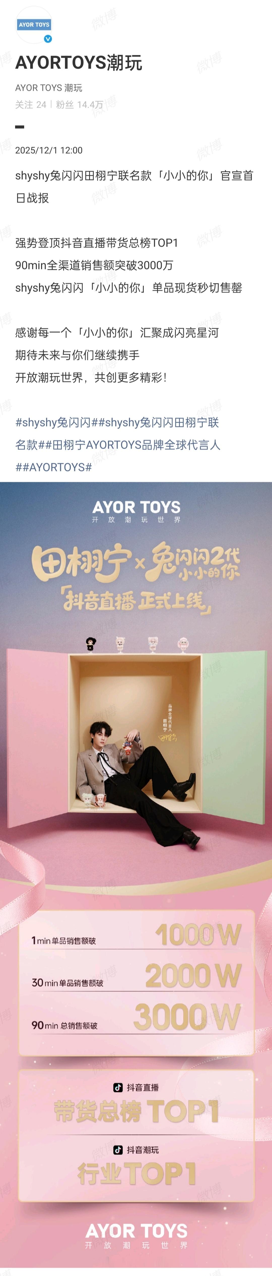 田栩宁90分钟全渠道销售额突破3000万田栩宁✘兔闪闪联名款「小小的你」官宣首日战报💥登顶🫘直播带货总榜TOP1!90min全渠道销售额突破3000万!shyshy兔闪闪「小小的你」单品现货秒切售罄!田栩宁联名款官宣战报