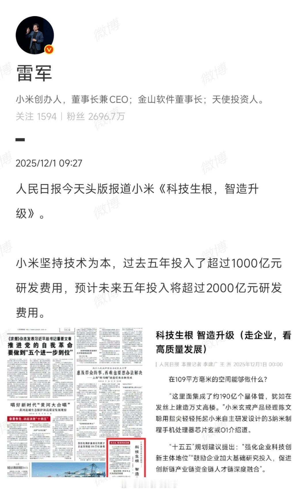 划重点~小米坚持技术为本!小米加码技术投入,未来五年研发预算将超两千亿,加速技术创新。雷军强调小米坚持技术为本