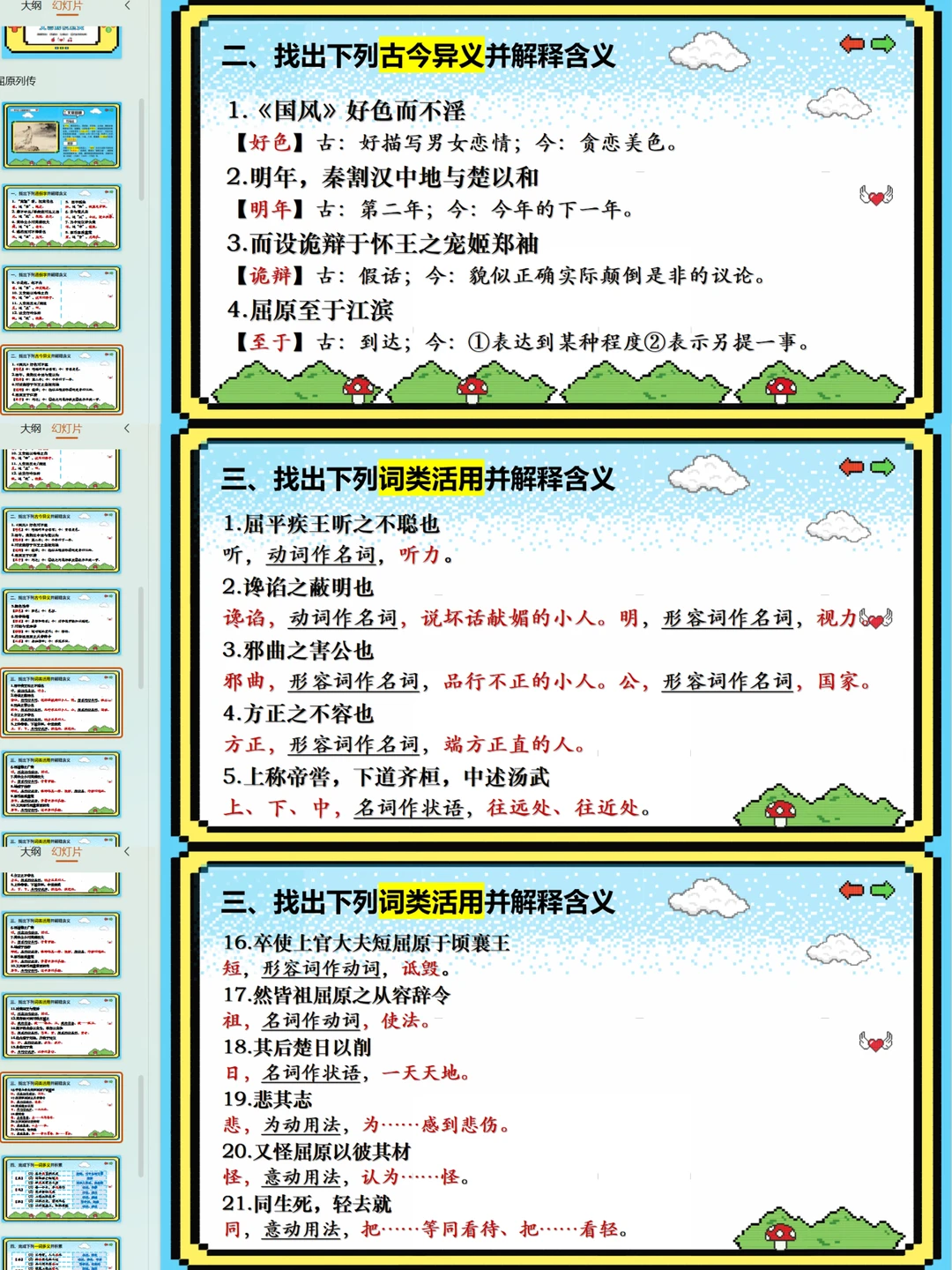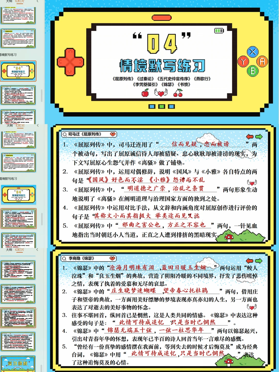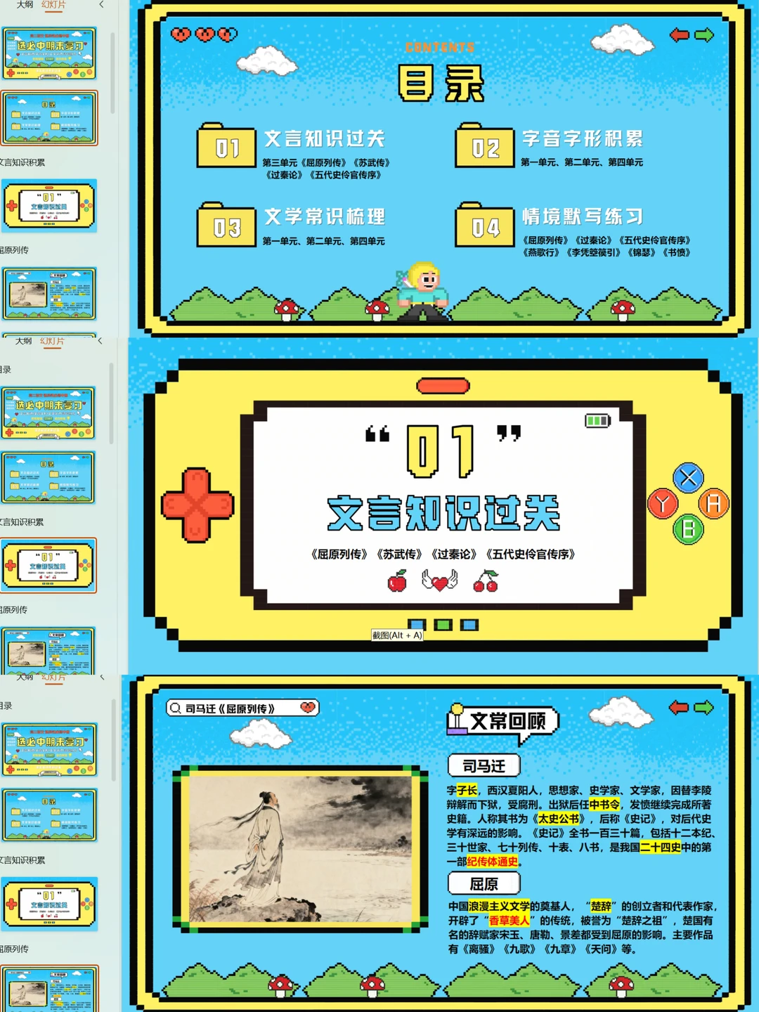 肝了一个月终于把选必中期末复习课件做出来了!这次课件是可爱的像素游戏风,从文言知识、字音字形、文学常识、情境默写四个方面进行复习。食用方法:提前布置复习任务,课堂随机提问,调动学生思维、提高学生积极性~