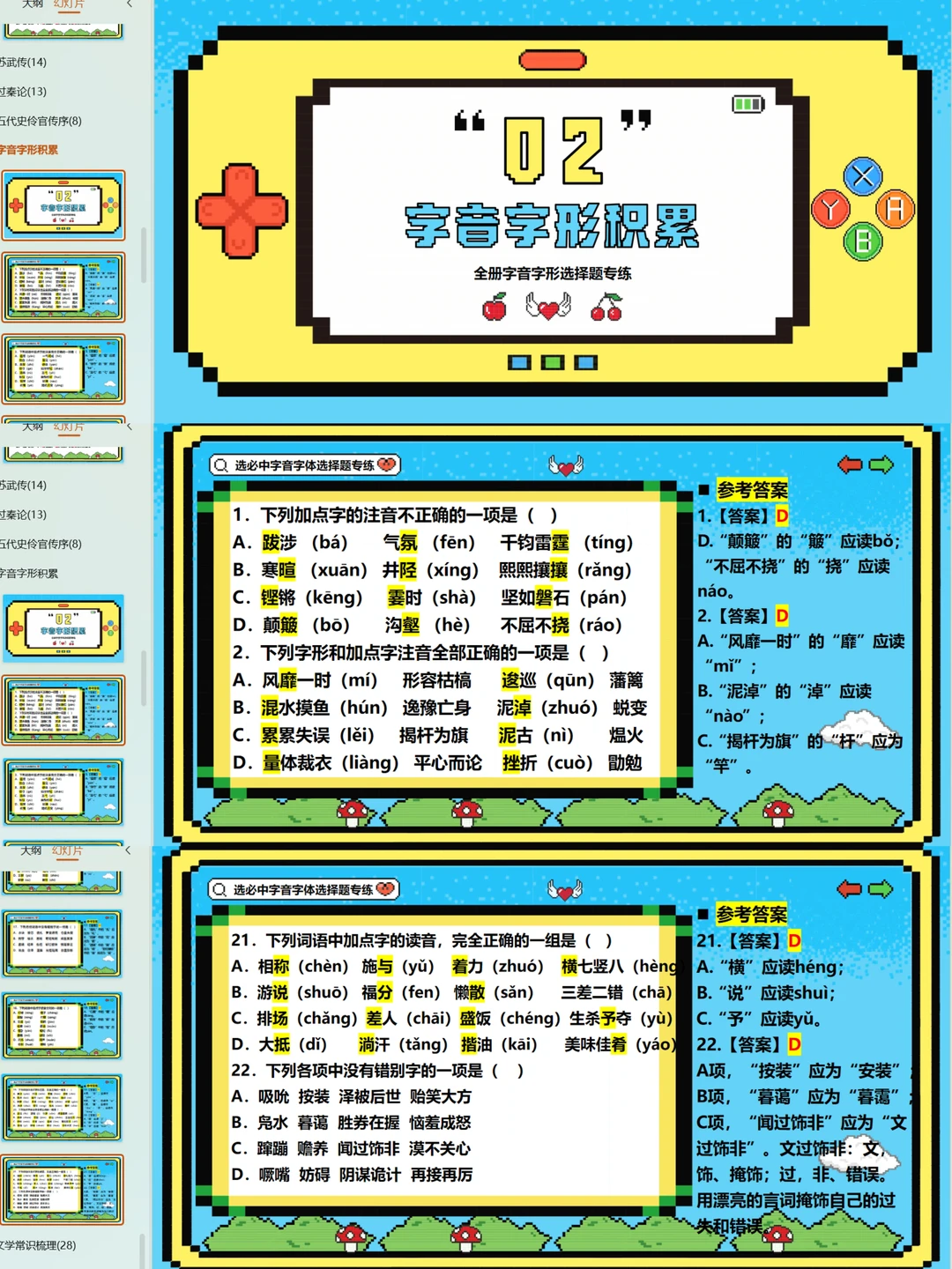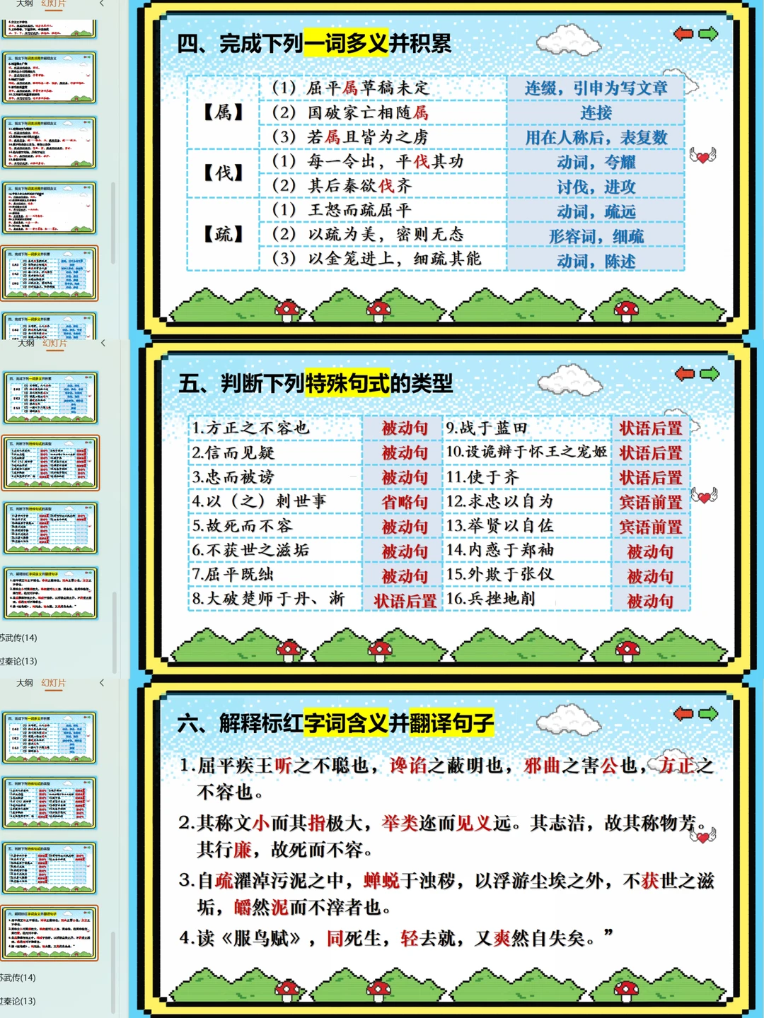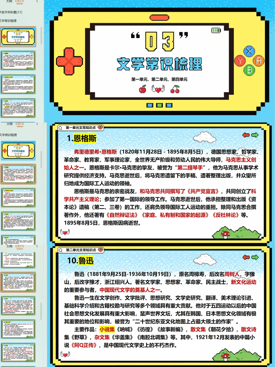 肝了一个月终于把选必中期末复习课件做出来了!这次课件是可爱的像素游戏风,从文言知识、字音字形、文学常识、情境默写四个方面进行复习。食用方法:提前布置复习任务,课堂随机提问,调动学生思维、提高学生积极性~