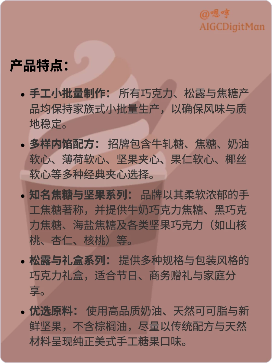 多样内馅配方: 招牌包含牛轧糖、焦糖、奶油软心、薄荷软心、坚果夹心、果仁软心、椰丝软心等多种经典夹心选择。