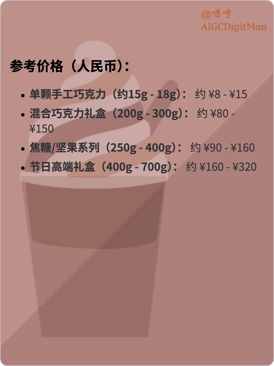 单颗手工巧克力(约15g - 18g): 约 ¥8 - ¥15