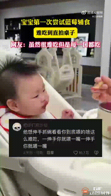 吉林一对夫妻给几个月大的宝宝喂蓝莓辅食时,宝宝刚吃了一口,就立即皱起眉头,嘴巴抿成一条线,然后用力地拍打了一下婴儿车,脸上的嫌弃简直溢于言表。 但有趣的是,即便宝宝很嫌弃蓝莓辅食的味道,可妈妈伸手喂食时,宝宝还是张嘴吃了,然后又是重复了一遍刚才的动作。 之后宝宝全程没有哭闹地吃着蓝莓辅食,只是每吃一口,就重复一次之前的动作,最后居然把辅食全部吃完了,这一幕直接惹得夫妻两人哈哈大笑。 爸爸甚至调侃道,“是不是吃开胃了?” 网友看完这段视频,都觉得这个宝宝简直太可爱了,从他的表情来看,他显然是不喜欢这份蓝莓辅食的,可能是因为第一次吃,所以受不了这个味道,但他的身体又很诚实,每次妈妈把汤勺递过来,他都乖乖吃下去了,最后只能用拍手来发泄。 家里有这样一个宝宝,实在是太有趣了,这对夫妻能够一起喂宝宝吃辅食,可见他们的感情很好,同时家庭氛围也很不错,而有了宝宝的助攻,也能让爸爸妈妈更加开心,增进夫妻两人的感情,难怪都说“孩子是夫妻感情的试金石”,这句话还是有一定道理的,毕竟谁会不喜欢这么可爱的宝宝呢,仅仅是看着,都能感受到幸福就在身边。大家怎么看呢?