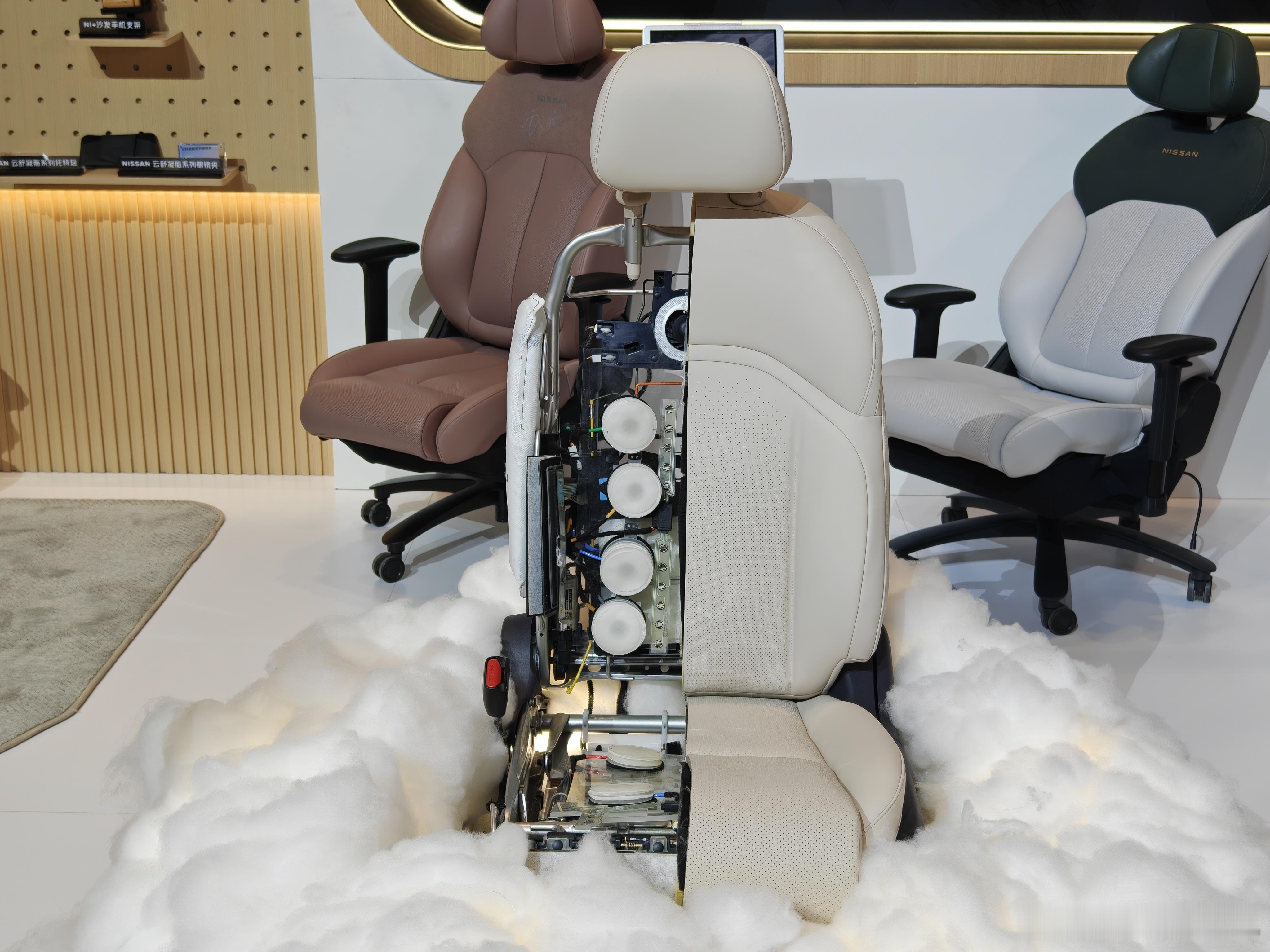 百万级后排大沙发 东风日产现在把大沙发IP做得很牢固。大沙发不仅是有文创,还有解剖座椅,还有各种改装的座椅展示。汽场全开大v聊车