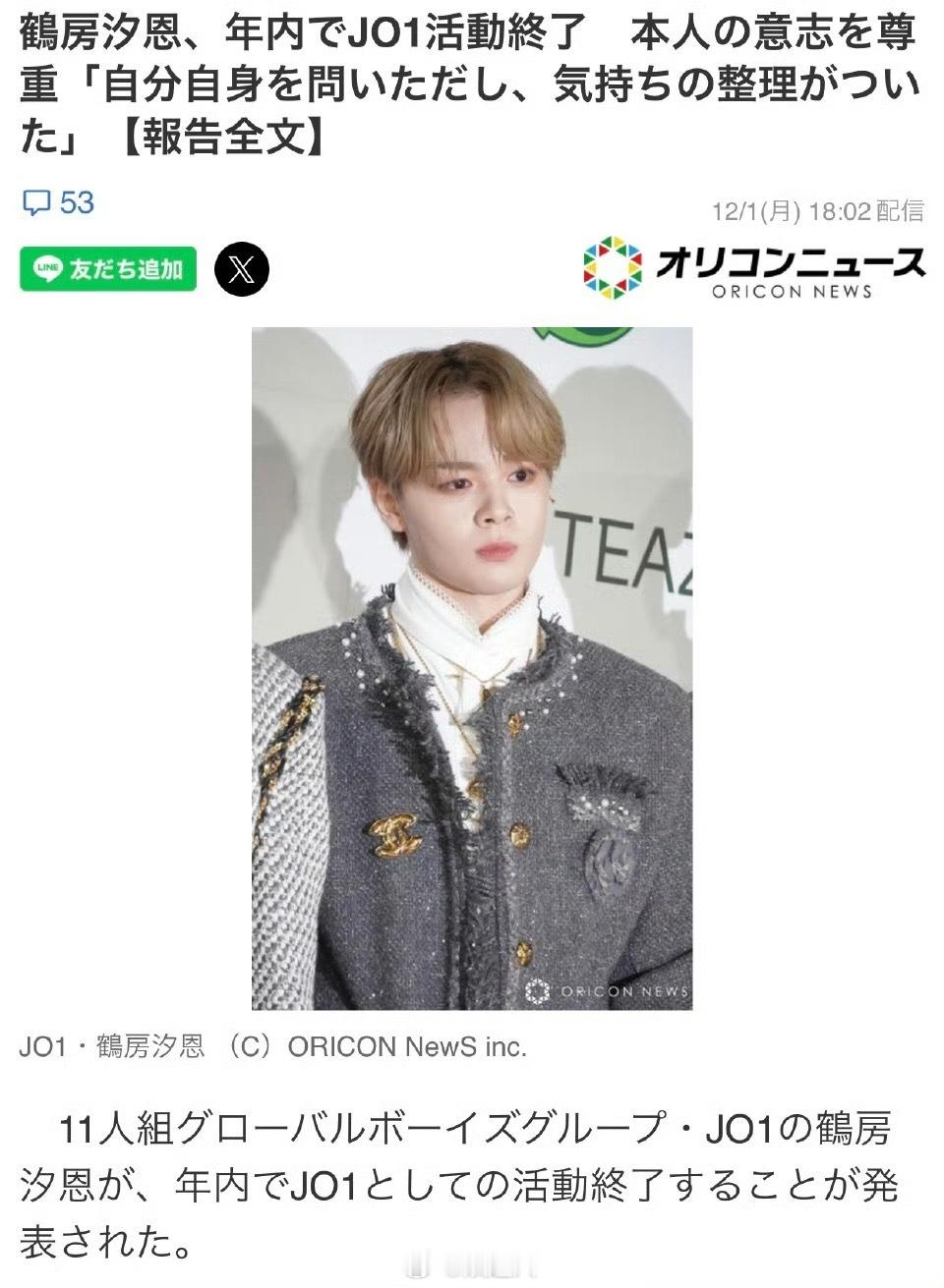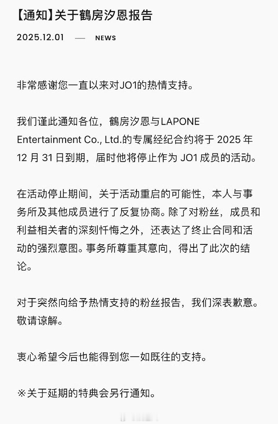 JO1鹤房汐恩年底退团退社JO1鹤房汐恩年底退团 JO1鹤房汐恩年底退团退社“除了对粉丝,成员和利益相关者的深刻忏悔之外,还表达了终止合同和活动的强烈意图。事务所尊重其意向,得出了此次的结论”