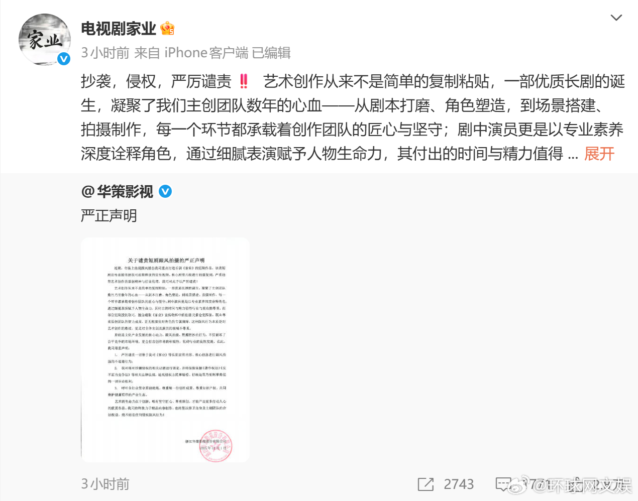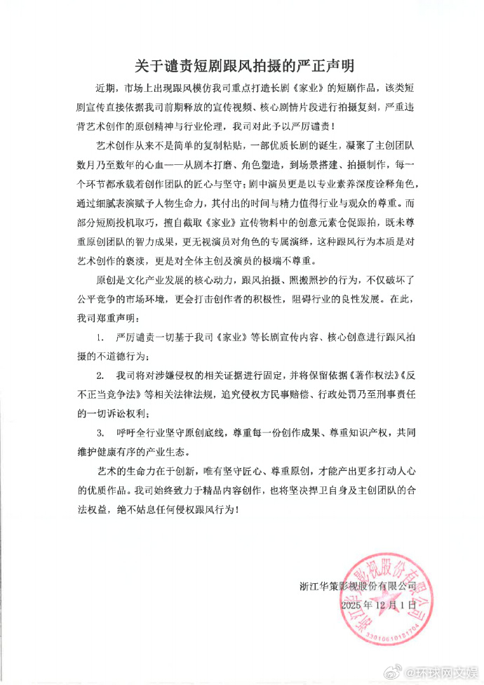 【#电视剧家业谴责短剧复刻# 】12月1日,电视剧《家业》和制片方华策影视发文,严厉谴责短剧跟风拍摄。称:“部分短剧投机取巧,擅自截取《家业》宣传物料中的创意元素仓促跟拍,既未尊重原创团队的智力成果,更无视演员对角色的专属演绎,这种跟风行为本质是对艺术创作的亵渎,更是对全体主创及演员的极端不尊重,严厉谴责”华策影视的声明中表示“近期,市场上出现跟风模仿长剧《家业》的短剧作品,该类短剧宣传直接依据我司前期释放的宣传视频、核心剧情片段进行拍摄复刻,严重违背艺术创作的原创精神与行业伦理,我司对此予以严厉谴责!”电视剧#家业# 由等主演,该剧于2025年4月24日宣布杀青。