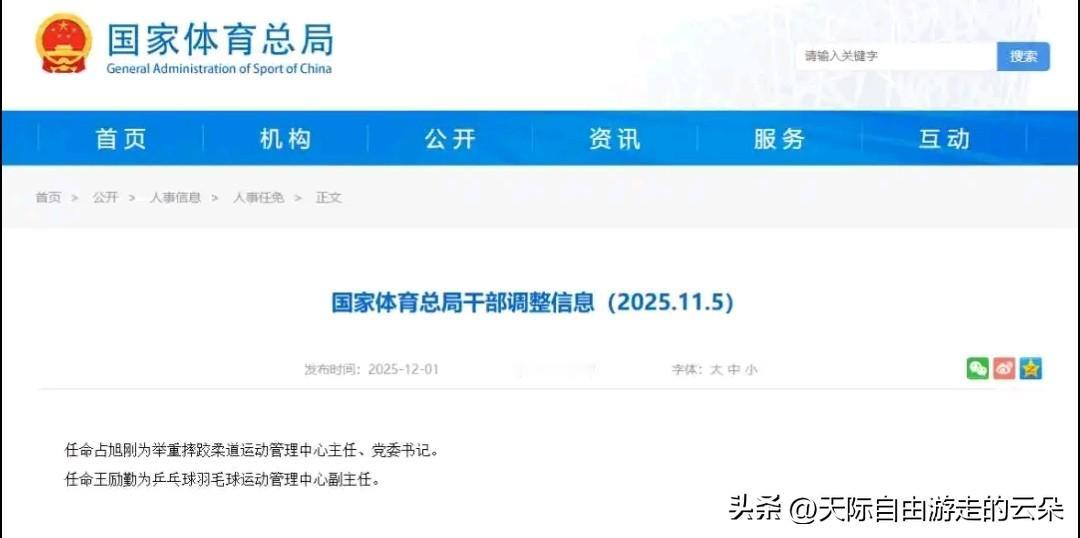 王励勤出任国家体育总局乒羽中心副主任 最新任命 12月1日,国家体育总局发布干部调整信息,任命王励勤为乒乓球羽毛球运动管理中心副主任。该信息发布于总局官网“人事信息—人事任免”栏目,文号为“干部调整信息(2025.11.5)”,发布时间为2025-12-01。 相关背景 今年4月23日,在中国乒乓球协会第十届会员代表大会第二次会议上,刘国梁辞去主席职务,王励勤当选新任主席,同时选举高元义、马龙为副主席,完成届中调整。 人物速览 王励勤,1978年6月18日生于上海,前中国乒乓球运动员、世界冠军、奥运冠军;现任中国乒协主席、上海市乒乓球协会会长、上海市竞技体育训练管理中心主任、党委副书记。 机构职能 乒乓球羽毛球运动管理中心为国家体育总局直属司局级事业单位,成立于1997年,承担全国乒乓球、羽毛球项目的行业管理职能,包括制定项目发展规划、组织国内外赛事、运动员注册与等级评定、反兴奋剂工作及后备人才培养等。
