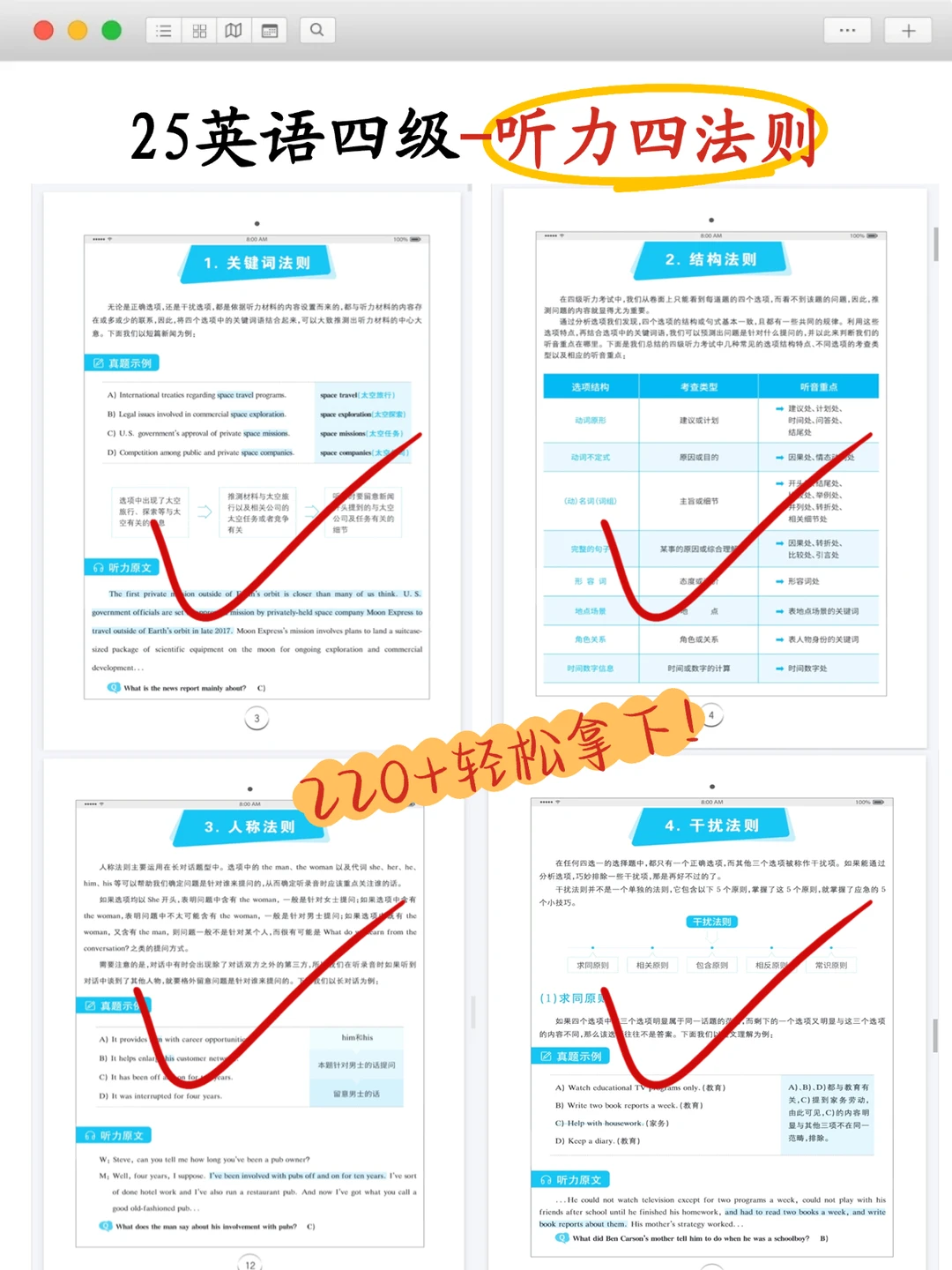 每天一套真题训练,天天磨耳朵,提升听感!👂 同时结合“听力四法则”进行精听训练: