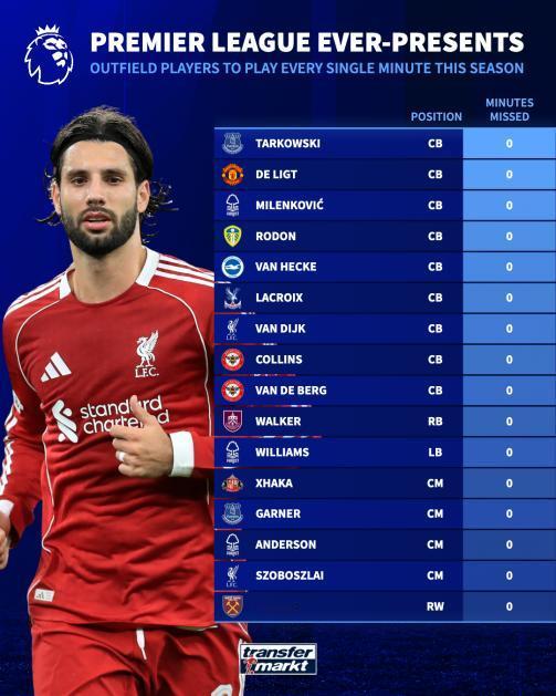 你知道吗?新赛季的英超联赛已经进行了13轮,有16名球员参加了每一分钟的比赛,我们可以把他们称之为“铁人”!因为在如今这个赛程紧张和讲究轮换的足球时代,这确实不容易做到!他们不仅要保持良好的状态,还要避免伤病的影响! 我们可以看到这些球员绝大多数是中后场球员,其中中后卫有多达9人之多!他们是埃弗顿的塔尔科夫斯基、曼联的德里赫特、森林队的米伦科维奇、利兹联的罗顿、布莱顿的范黑克、水晶宫的拉克鲁瓦、利物浦的范戴克、布伦特福德的科林斯和范登贝尔赫。 还有两名边后卫也完成了全勤,他们是伯恩利的沃克和森林队的威廉斯。当然这16名球员中还包括4名中场球员,桑德兰队长扎卡、埃弗顿的加纳、森林队的安德森以及利物浦的索博斯洛伊!赛季开始时,很多人认为索博斯洛伊要和维尔茨竞争出场时间,但他一直是斯洛特信任的人!西汉姆联的右边锋鲍恩是本赛季英超唯一全勤的前场球员!