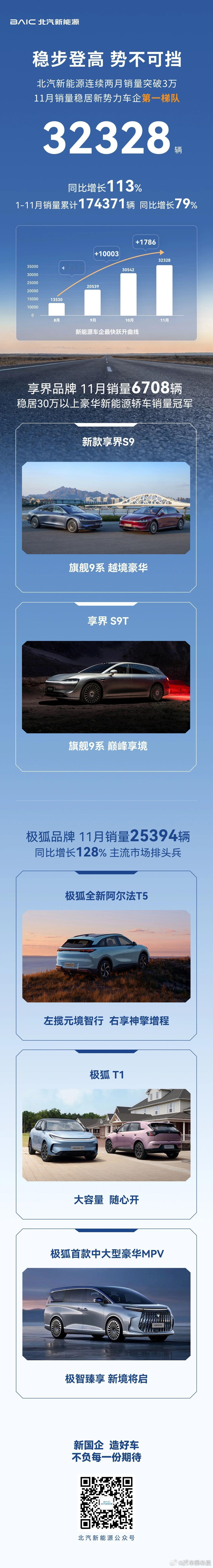 极狐汽车11月销量25394辆 同比增长128.32%;1-11月累计销量136592辆,同比增长97.99%。北汽新能源11月销量32328量,同比增长113%