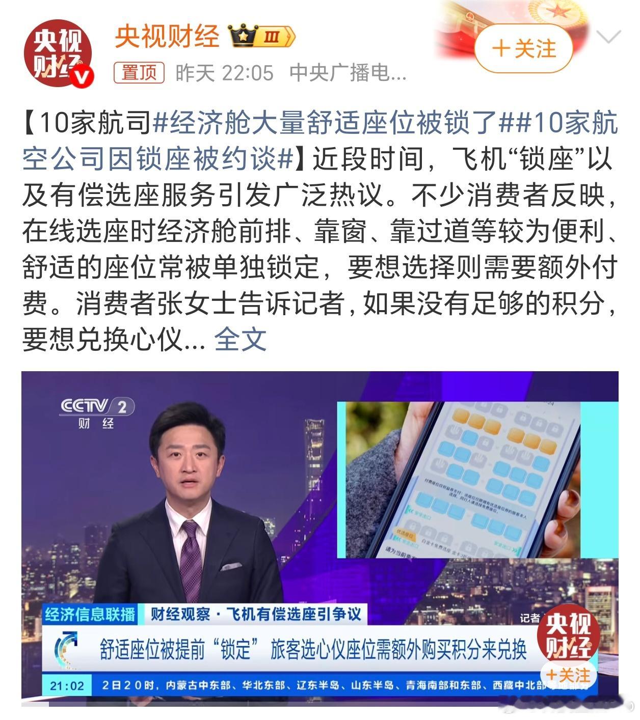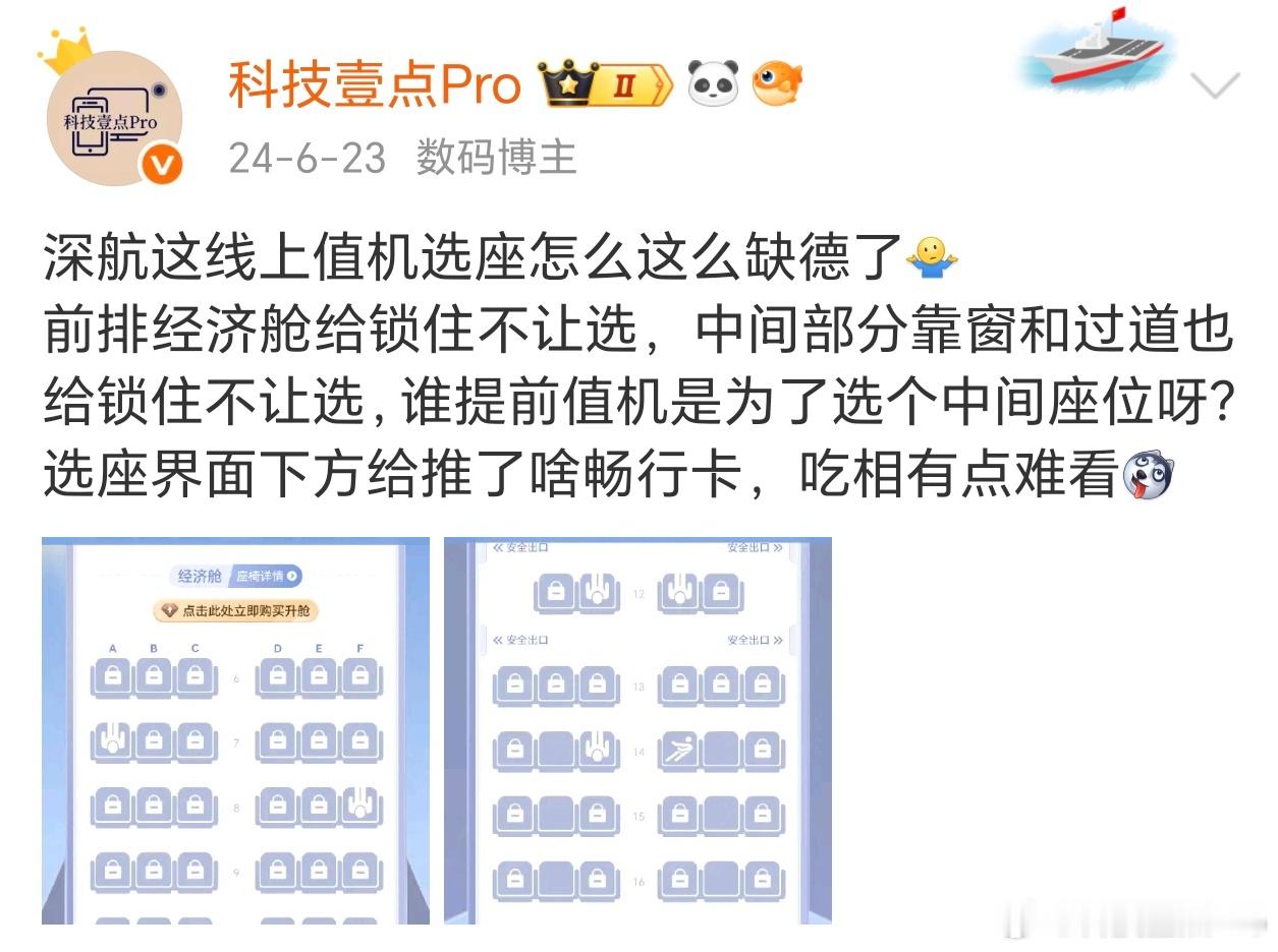 看到“经济舱大量舒适座位被锁了”这个话题真的深有感触,之前我还专门吐槽过。那次线上值机的时候,不仅是前排经济舱被锁了,就连中排的靠窗和过道都被锁了,吃相真的很难看。