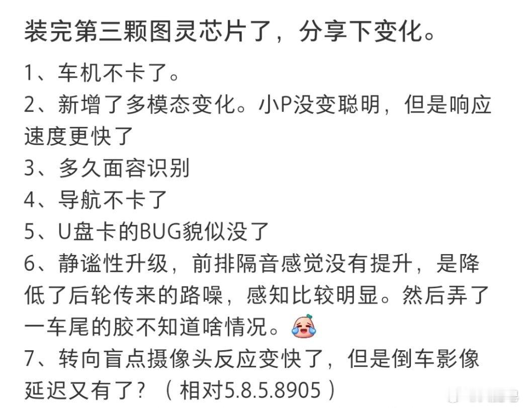 有网友已经把小鹏P7升级了第三颗图灵芯片,目前看反馈相对来说都是极大进步的提升。我现在车有很多地方其实很期待能够在这次更新上得到解决。到时候我拍个视频。