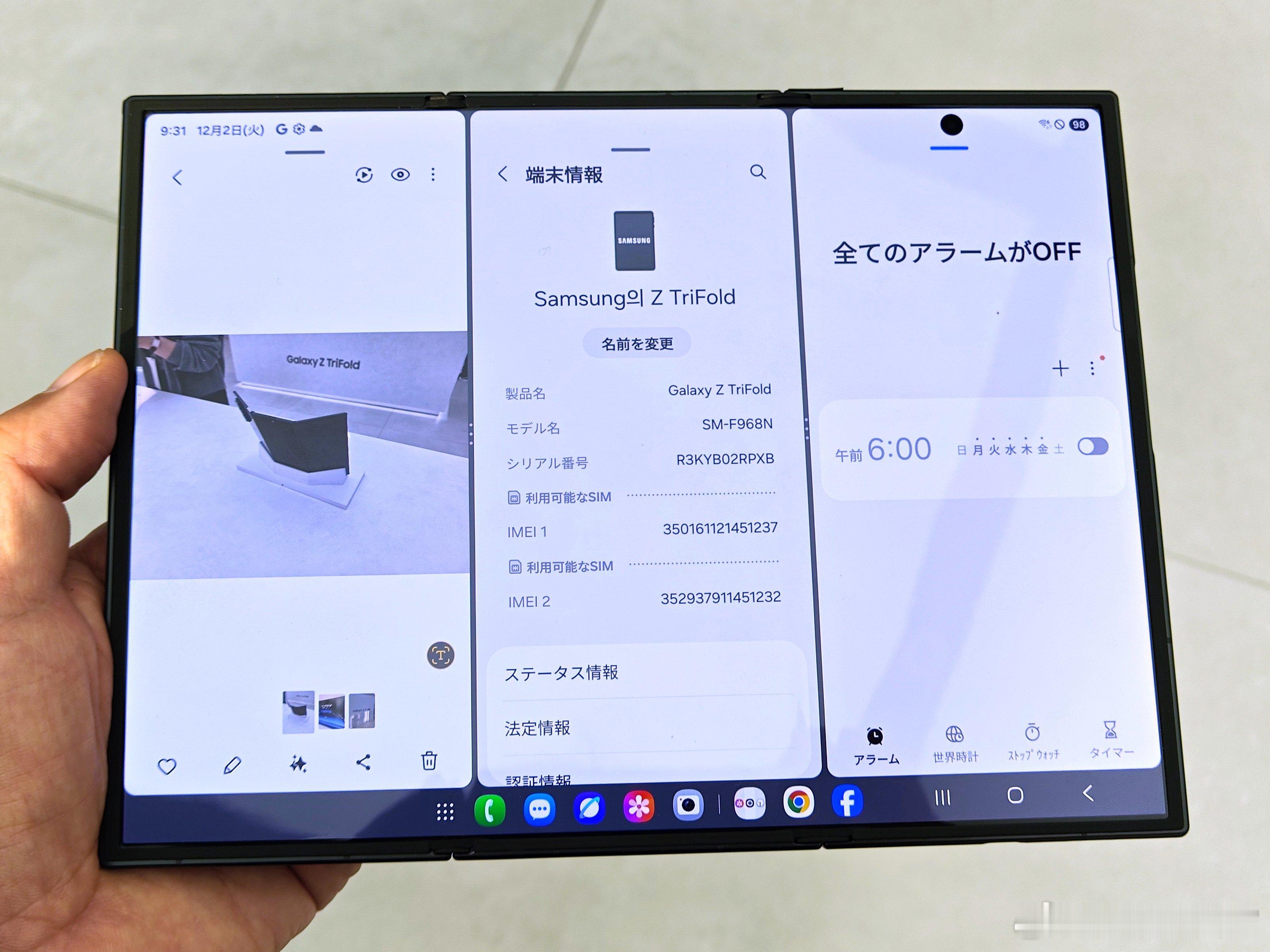 三星首款三折叠手机发布三星首款三折叠Galaxy Z TriFold来了,和之前曝光的一样,G形内折设计,6.5英寸外屏 + 10英寸内屏,展开后可以同时打开三个应用。搭载骁龙8至尊版for Galaxy处理器,后置2亿像素主摄 + 1200万超广角 + 1000万长焦三摄,内置5600mAh电池,支持45W有线 + 15W无线快充,折叠厚12.9mm、展开最薄处3.9mm,重309g,支持IP48级防水,韩国售价359.04万韩元(约人民币17300元)。讲真,你们觉得咋样?