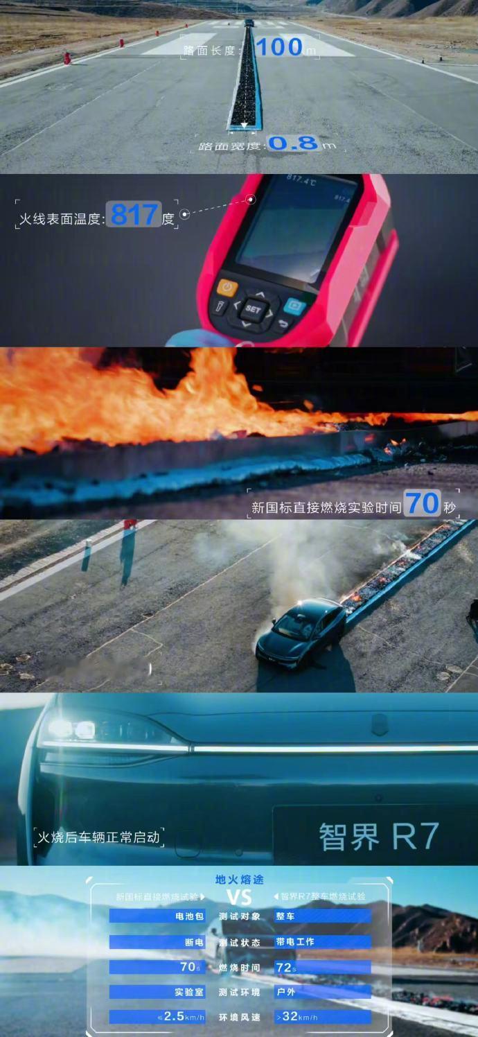 智界R7十万公里电池安全挑战新能源车电池安全备受关注,智界汽车以硬核测试展现实力。智界新S7与R7搭载的华为巨鲸800V高压电池平台,经十万公里健康度、极限火焰炙烤、户外针刺三项测试,电池表现优异,衰减慢、耐高温、危险可控,打消用户对电池寿命和安全的顾虑。这得益于其15层安全防护体系,结合AI预警等实现“整包永不起火”,加上严苛工艺与超国标验证,安全保障堪称“天花板级”。