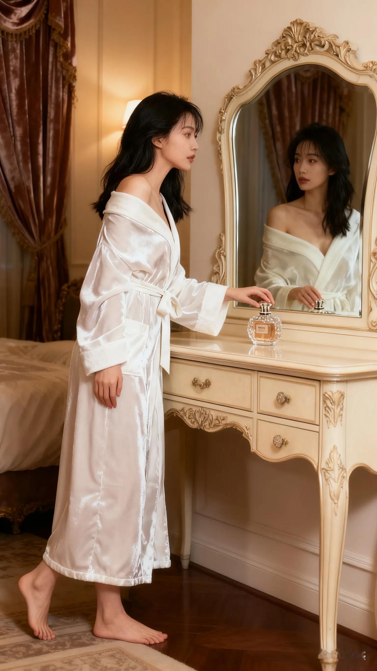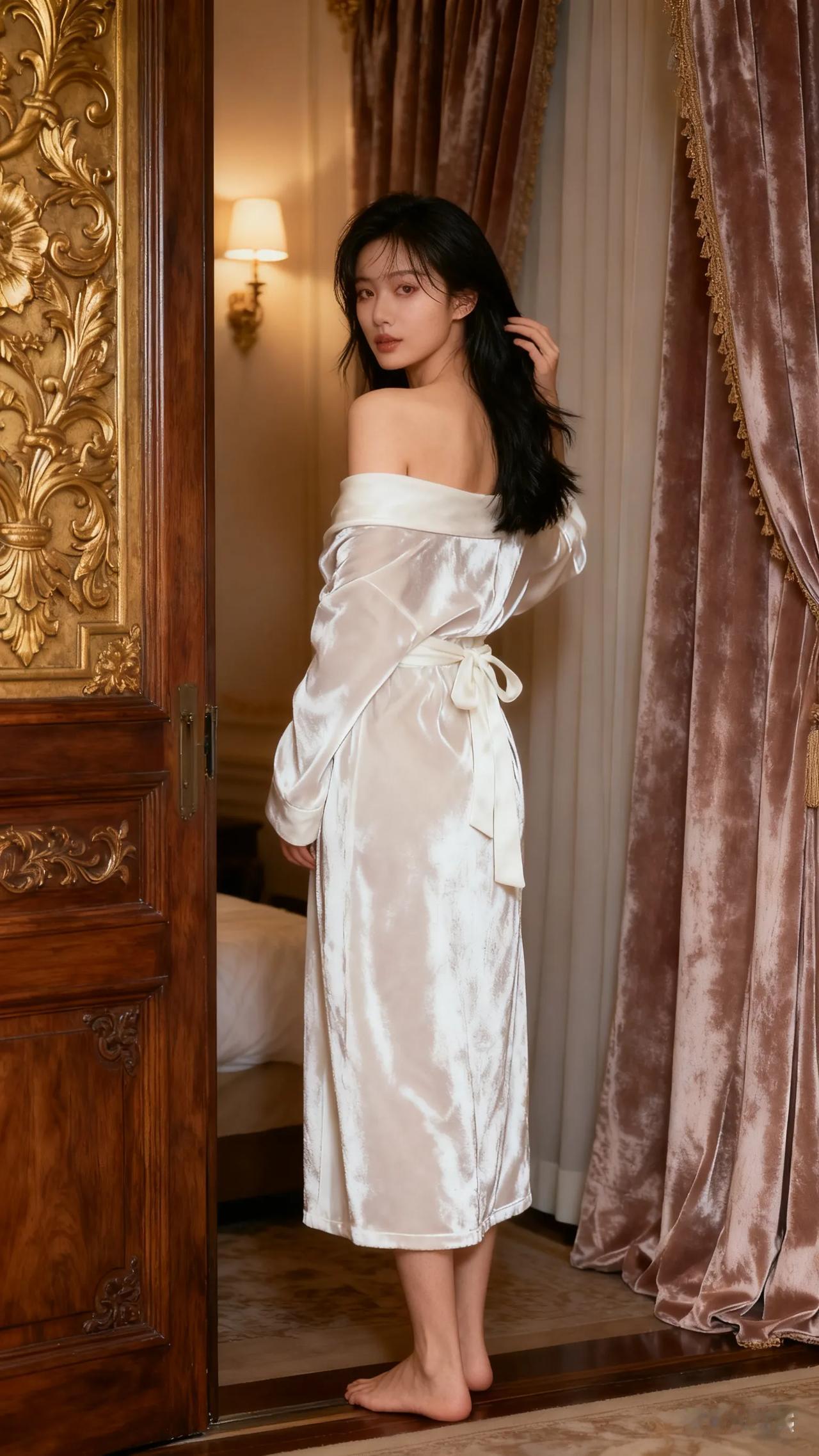优雅黑发少女,蕾丝裙摆,复古画框,静谧卧室时光。
