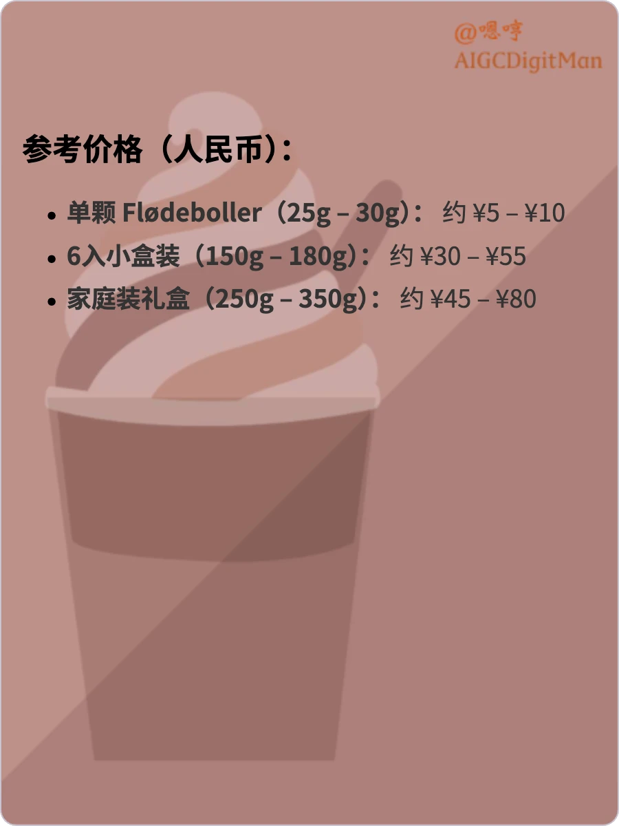 单颗 Flødeboller(25g – 30g): 约 ¥5 – ¥10