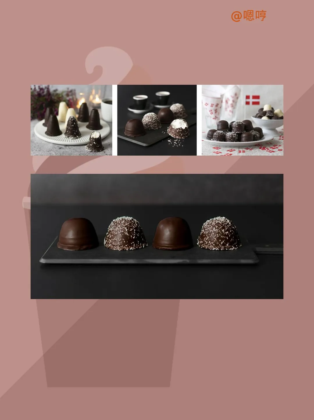 丹麦传统 Flødeboller(巧克力棉花糖球): 品牌核心产品,外层为脆口巧克力壳,内层是柔软轻盈的蛋白棉花糖,底部通常搭配威化或椰子饼干。