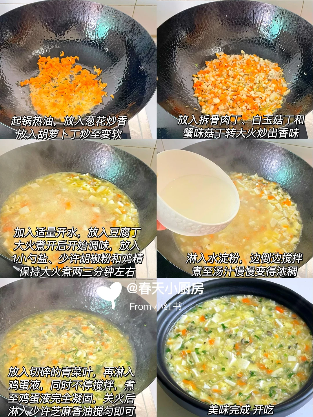 做菜我是认真的 🌈🌈 秋冬的餐桌,最治愈的莫过于一碗热气腾腾的羹汤。不重油不重盐,入口绵密丝滑,一口下去暖心又暖胃,这道菌菇拆骨肉豆腐羹,它集齐了拆骨肉的香、菌菇的鲜、豆腐的嫩,做法简单,新手也能一次成功。 🌿🌿食材 准备折骨肉丁半碗,提前炖好的拆骨肉拆成小丁,胡萝卜一个,白玉菇、蟹味菇各一小把,嫩豆腐一块,鸡蛋一个,青菜叶适量,再准备葱花、盐、鸡精、水淀粉适量、胡椒粉少许、食用油适量 🔍🔍做法见图三图四哈