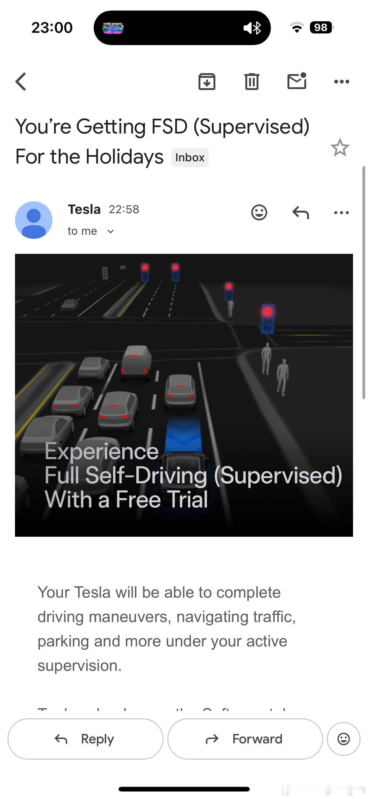 加班完看到马一龙送的感恩节礼物,1个月免费FSD。自从有了电车之后越来越抠了,109美刀一个月的FSD怎么可能舍得连续订阅。