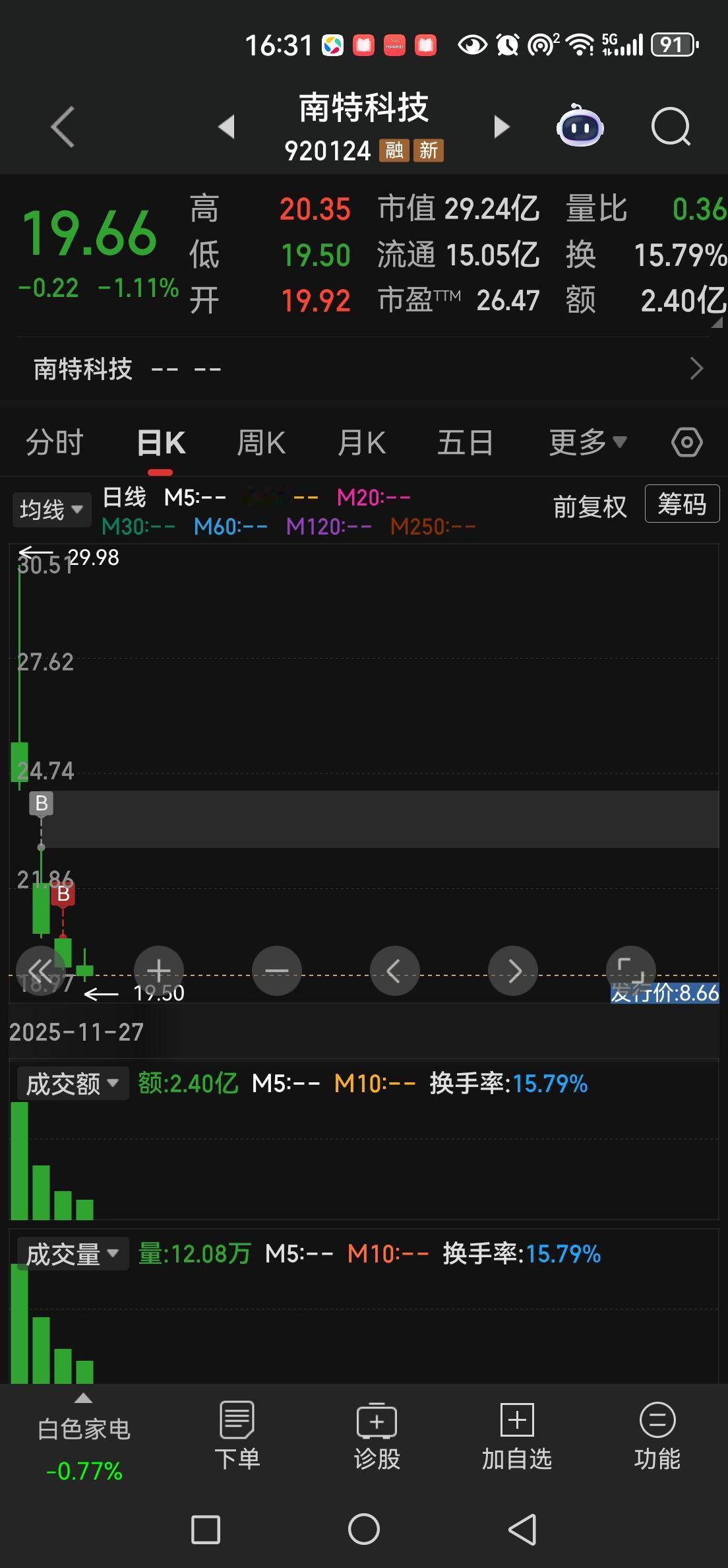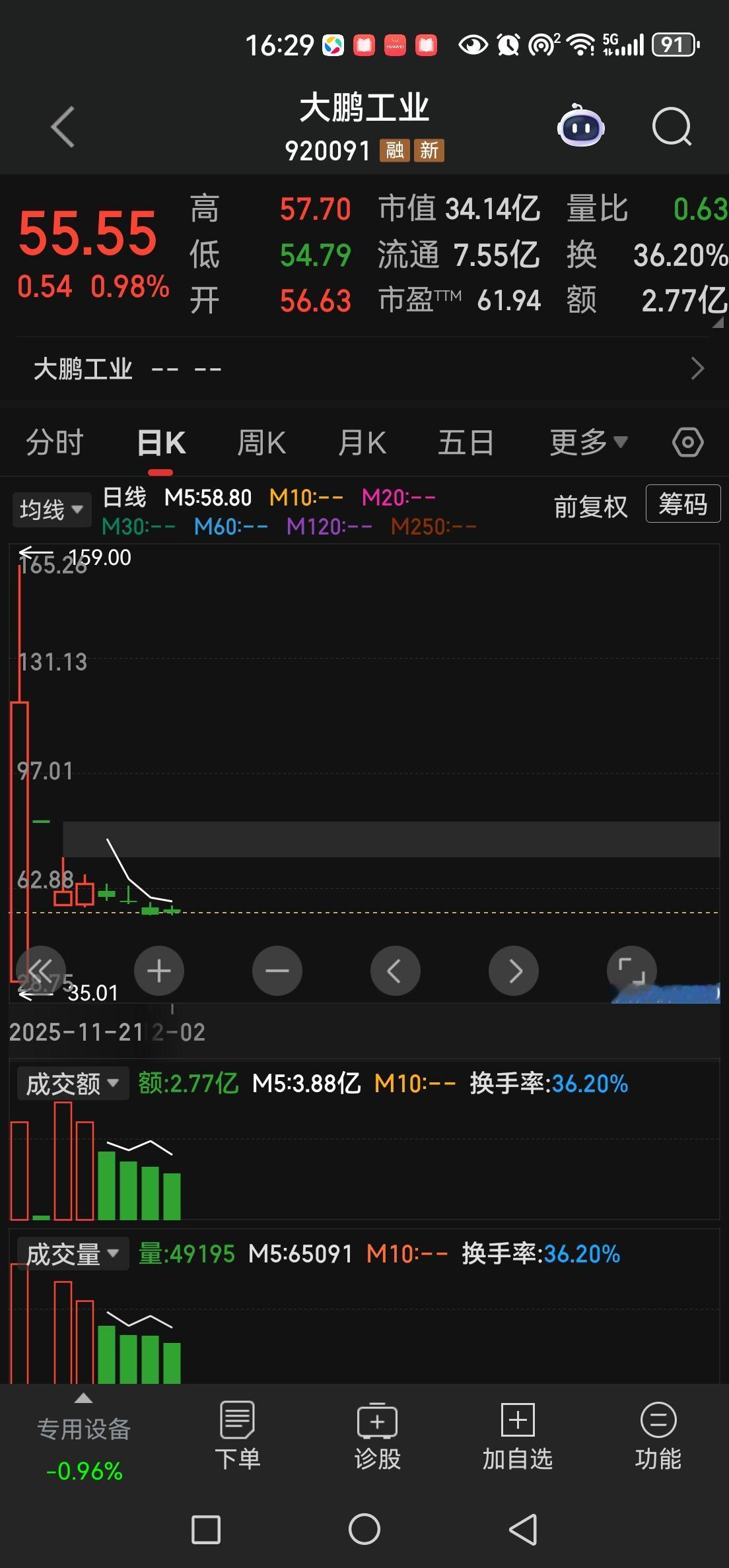 大鹏工业是会玩的,今天收盘价收个豹子数55.55,上市首日盘中最高涨幅1666.67%,说不是人为操控谁信? 又有多少人怀揣着大鹏工业的梦想,买入了南特科技,我昨日尾盘吸纳了一点点,早盘冲高幅度有限,懒得去动,就当练练盘感吧。北证如果没有增量游资的介入,基本上你就是和量化在玩,纪律你肯定玩不过他,你就是比他多一点点感情。