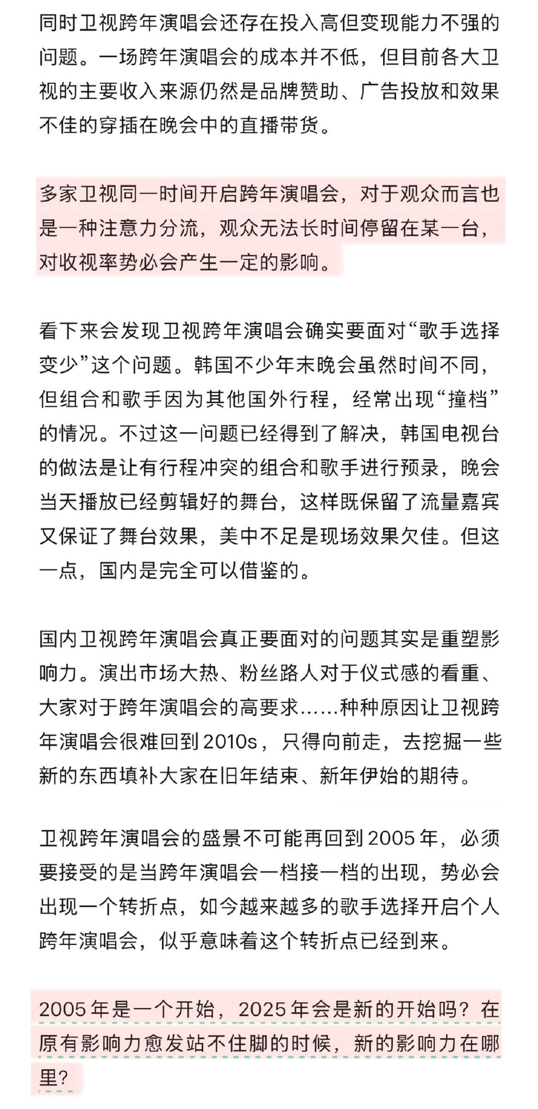 留给卫视跨年演唱会的歌手不多了今年的跨年演出好多人啊 业内人士透露卫视跨年演唱会不仅投入成本高,变现渠道还十分单一。再加上多家卫视同期开唱分流观众注意力,叠加内容缺乏突破,影响力持续下滑。