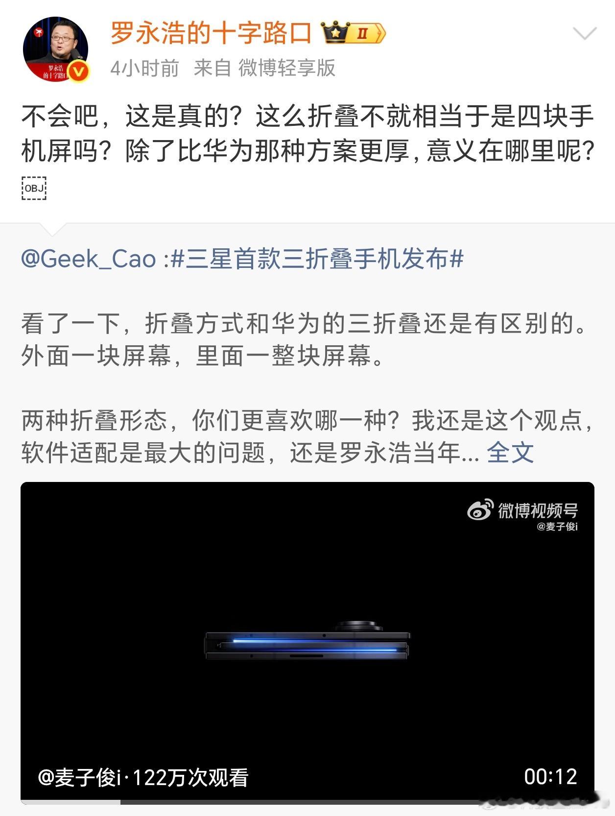 罗永浩谈三星三折叠,哈哈哈,观点依然非常犀利。我也觉得华为的三折叠方案更巧妙,可以做直板机、可以做大折叠、可以做三折叠,机身还更轻巧。