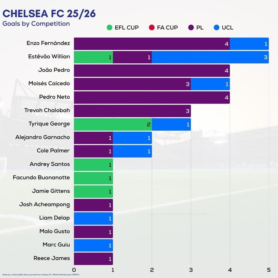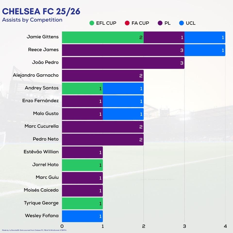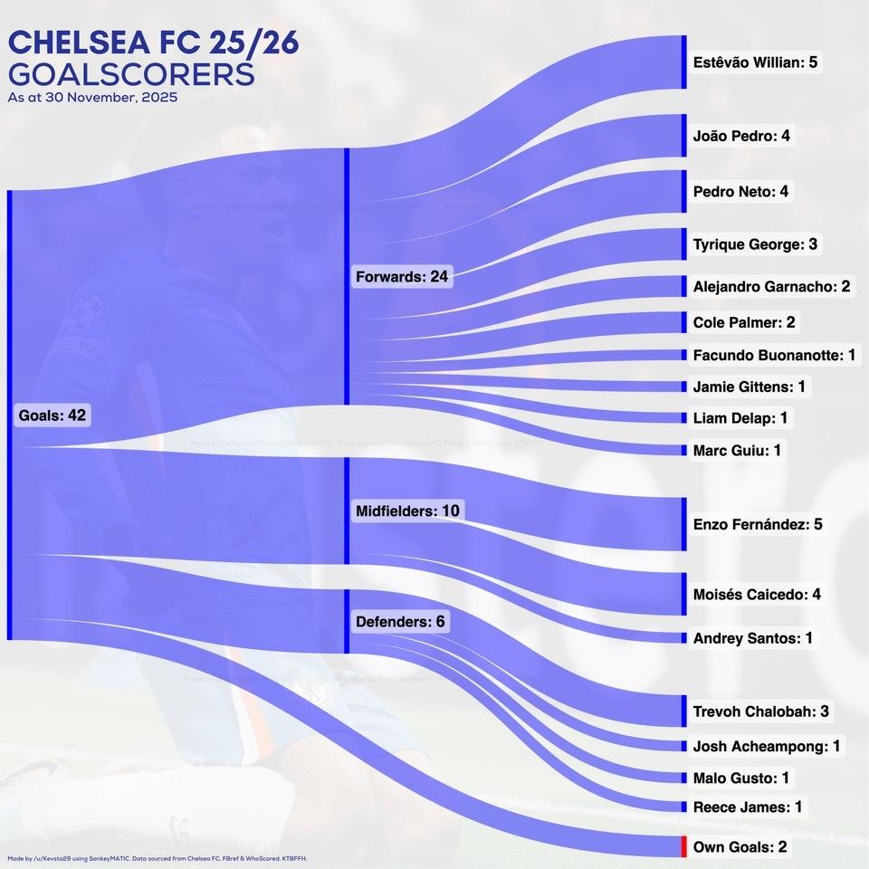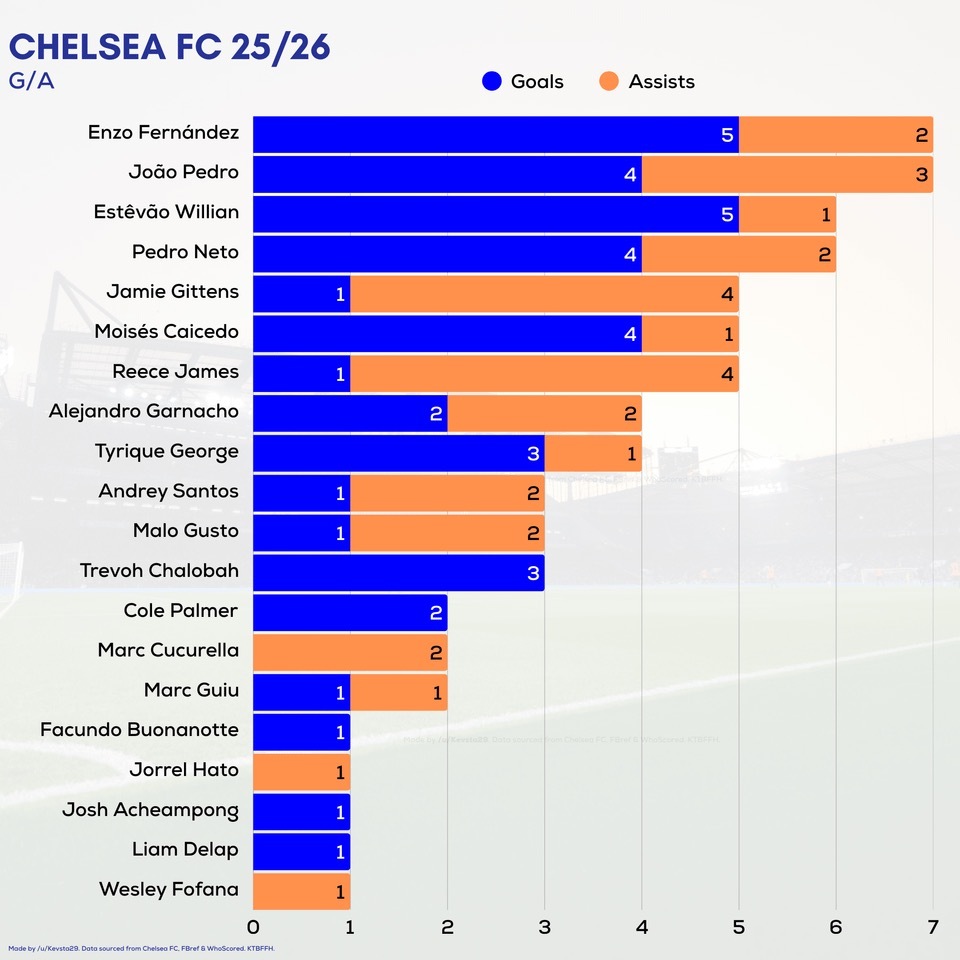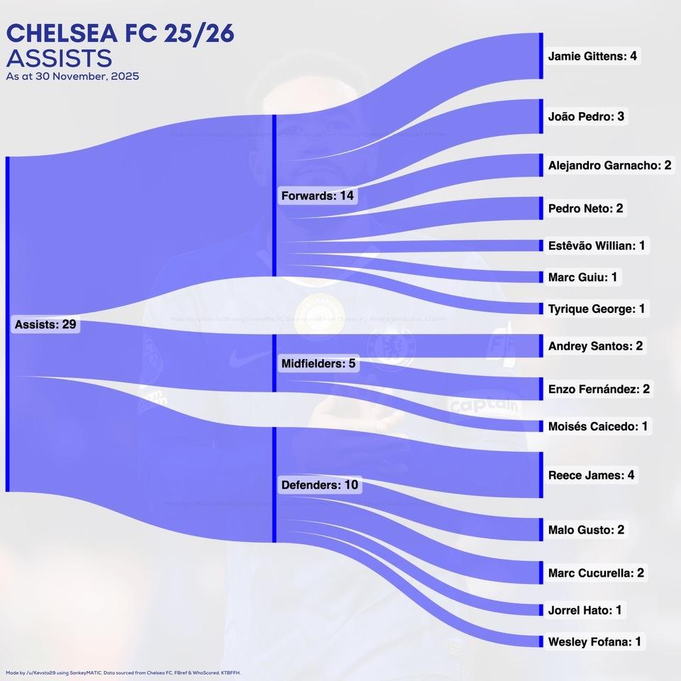 切尔西本赛季进球/助攻统计【截止到11.30】切尔西