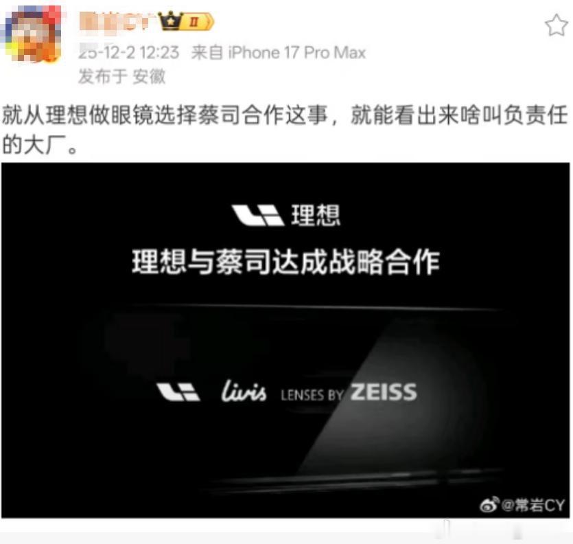 这时候汽车博主的弱点显露了:负不负责任和用的蔡司的镜片没啥关系。毕竟你不是在造光刻机,人家也不会拿光刻机的技术给你造眼镜片。例如我玩单反的,在专业影像领域,比如蔡司Otus系列镜头当然依然属于头部阵营,而且我也买过几只,甚至第一只镜头都是蔡司的。但对现在的索尼佳能尼康原厂的顶级头根本不弱于蔡司,甚至有的指标更强。要知道这种级别的对比,已经需要用到专业的分辨率卡和色卡才能区分了。用原厂、蔡司相同规格的镜头,拍两张相同取景下的照片,99%的人都无法分辨。从专业影像领域换到个人数码消费品来说,蔡司更是意义不大。比如眼镜的透光率99%和98%,同样体验几乎没有差距,同样99.9%的人都无法分辨。再比如镜片的核心参数指标阿贝数,蔡司和依视路在1.50和1.74折射率的阿贝数完全相同,但在1.56和1.60折射率上,依视路的阿贝数略高于蔡司。这使得依视路在中低折射率(1.56-1.60)的视觉清晰度方面具有微弱优势,而蔡司在高折射率(1.74)的边缘优化和轻薄度方面表现更佳。日常镜片的耐磨性、抗污能力和防蓝光我认为反而是一般人应该更多注意到的。再比如蔡司的铂金膜透光率略高于依视路膜岩,但依视路膜岩的耐磨性更强。高端的品牌很多时候只是有更多溢价,未必适合每个人。真正对用户负责的产品,我认为应该把选择权交给用户,厂家做好本身智能眼镜的功能就好了。蔡司很好,但没必要神话。当然了,为了一些原因,随便喊个口号想按也都能硬按上。另外说一句,最近的夸克ai眼镜 目前看起来不错,等评测多了看看要不要入一个。毕竟依托于阿里的AI模型,再加上夸克这个多功能浏览器,我日常使用频率非常高。