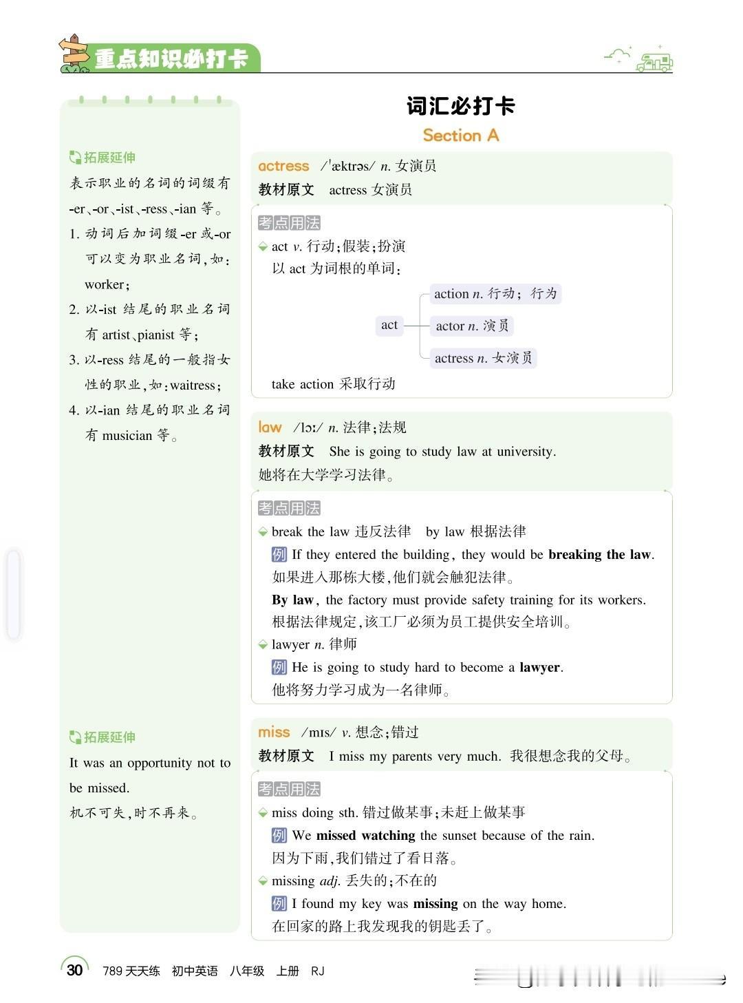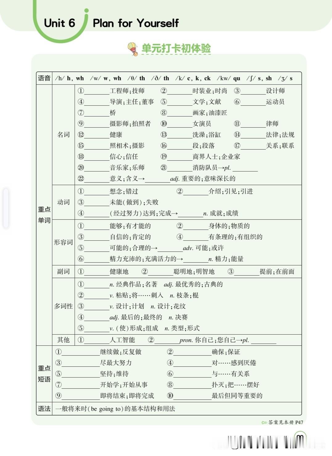 人教版八年级上册Unit 6 计划自己:掌握关键单词和短语!在学习人教版八年级上册Unit 6时,掌握关键单词和短语可是开启知识大门的钥匙。像“grow up”,简单的两个词组合在一起,却有着“长大、成长”这么重要的含义。当我们说“I want to grow up to be a scientist”,就能清晰表达出自己的梦想。 还有“computer programmer”,这可是紧跟时代潮流的职业表述,代表着计算机程序员。想象一下,未来用代码创造出各种奇妙软件的你,是不是超酷? “pilot”这个单词也不容小觑,它代表着飞行员。每次看到飞机在天空翱翔,我们就可以联想到这个单词。 而短语“be going to”更是重点中的重点,它用来表达将来打算做某事。比如“He is going to study hard for the exam”,清晰地表明了未来的计划。掌握好这些关键单词和短语,我们就能在英语学习的道路上大步向前啦! 八上课课练英语 英语提分规划