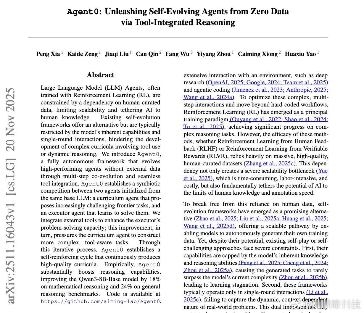 这篇斯坦福大学的论文直接让我大脑宕机了。他们构建了一个AI智能体框架,从零数据起步——无人工标注、无精心设计的任务、无演示样本,却在性能上超越了所有现有自博弈方法。它名为Agent0:通过工具集成推理实现从零数据释放自进化智能体(Agent0: Unleashing Self-Evolving Agents from Zero Data via Tool-Integrated Reasoning)。他们达成的成果简直匪夷所思。迄今为止,你见过的所有“自我提升”智能体都存在同一个致命缺陷:它们只能生成比现有能力稍难一点的任务。因此,它们会立刻陷入瓶颈。而Agent0打破了这层天花板。事情出现了转折:研究人员从同一个基础大语言模型(LLM)中生成两个智能体,让它们相互对抗。1)课程智能体(Curriculum Agent):持续生成难度递增的任务2)执行智能体(Executor Agent):借助推理+工具尝试解决这些任务每当执行智能体能力提升,课程智能体就被迫提高任务难度;每当任务难度升级,执行智能体就被迫进化迭代。这形成了一个闭环的、自我强化的课程螺旋,且全程从零开始——无数据、无人工干预、无任何外部输入。仅凭两个智能体相互推动,共同迈向更高阶的智能水平。更厉害的是他们加入的“制胜法宝”:在循环中嵌入完整的Python工具解释器。执行智能体学会用代码推理解决问题;课程智能体学会设计需要工具辅助才能完成的任务。于是两个智能体持续升级迭代。最终结果?→ 数学推理能力提升18%→ 通用推理能力提升24%→ 性能超越R-Zero、SPIRAL、Absolute Zero,甚至击败了采用外部专有API的框架→ 全程零数据支撑,仅依靠自进化循环实现研究人员还展示了任务难度随迭代次数上升的曲线:任务从基础几何题起步,最终升级为约束满足问题、组合数学题、逻辑谜题以及多步骤工具依赖型问题。这是我们目前见过的最接近大语言模型自主认知成长的成果。Agent0不仅仅是“更优秀的强化学习(RL)”。它为智能体搭建了自我引导智能提升的蓝图。智能体时代就此开启ai创造营ai生活指南科技先锋官