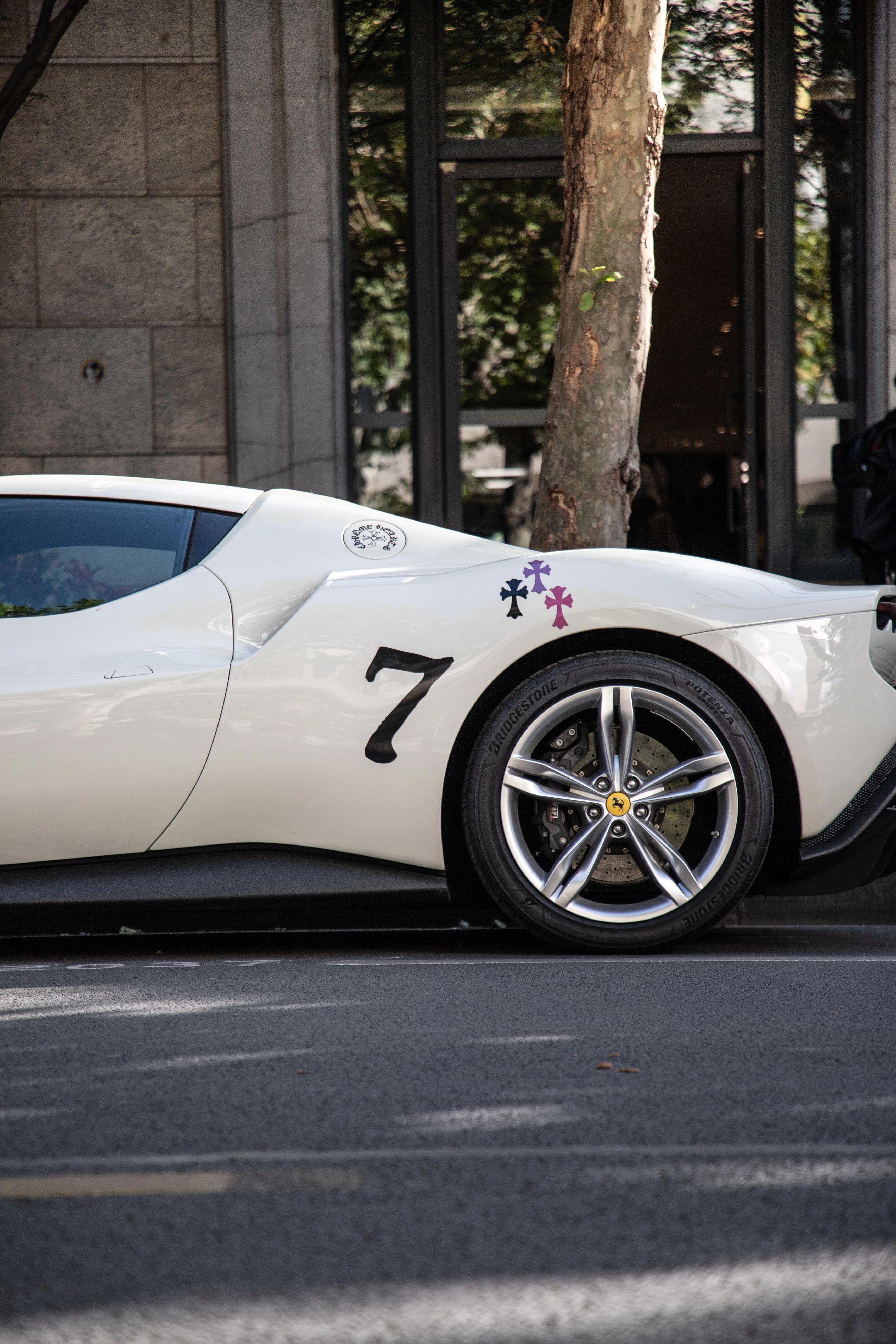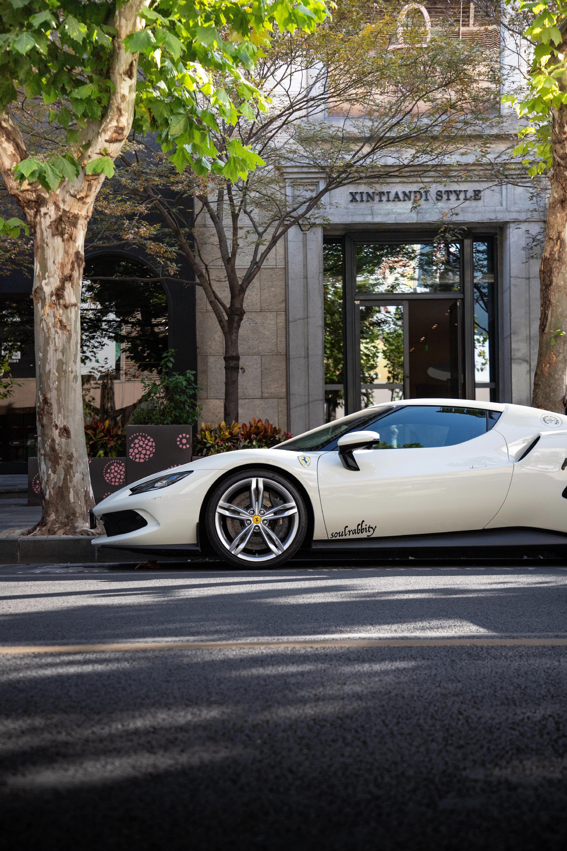 阳光明媚 冬日暖阳。纯白 也不是黑色车顶 法拉利296GTB 一个午后 梧桐树下 一台车