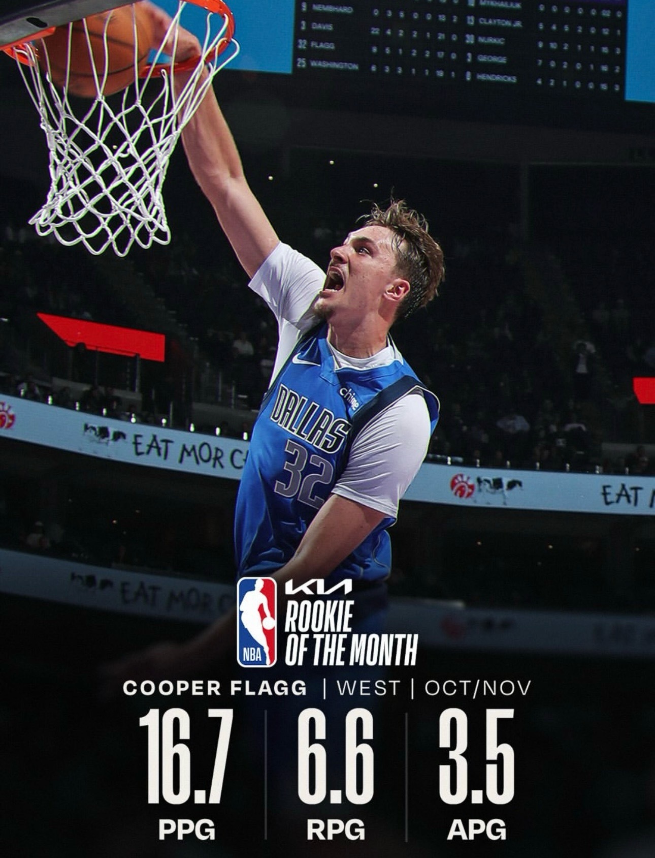 今日NBA官方公布了10-11月东西部月最佳新秀,状元弗拉格与黄蜂4号秀克尼佩尔分别当选。弗拉格在这段时间里场均可以得到16.7分6.6篮板3.5助攻。