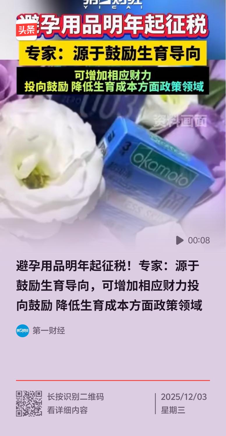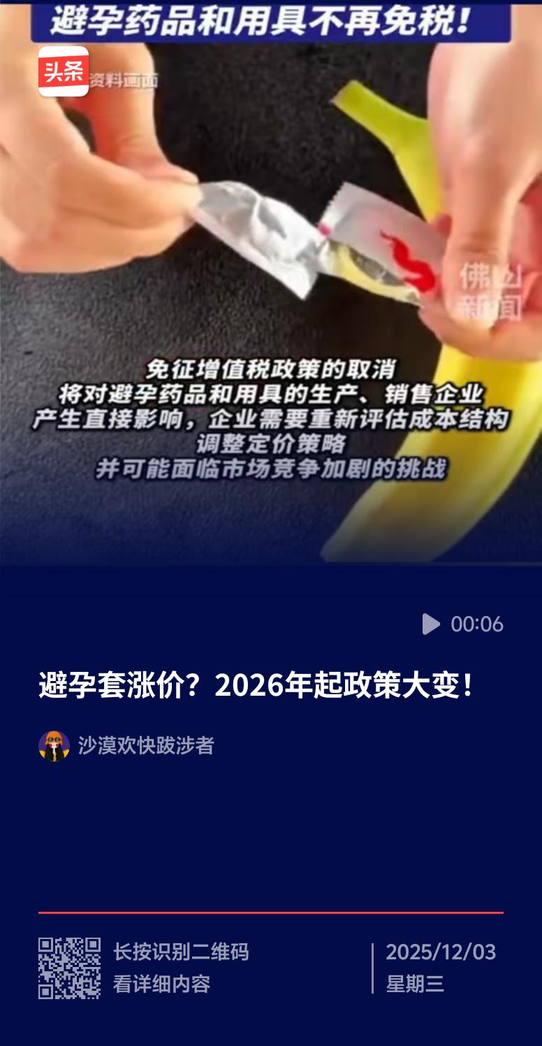 2026 年 1 月 1 日起,避孕药品和用具要恢复征收增值税了,消费者大概率要为此多掏钱。自 1993 年起,它们就被列入增值税免税项目,此后一直延续。但新通过的增值税法施行后,免税名单里没了它们。目前这类产品适用 13%的增值税税率,比如 20 元一盒的避孕套,以后成本可能增加两块多,售价也会相应上调。 专家分析,以前免税是因推行计划生育,为控制人口增长。而现在人口政策变化,这或许就是取消免税的主因。三十多年的免税优惠没了,以后买避孕用品得算上这笔税钱了。 避孕用品征税