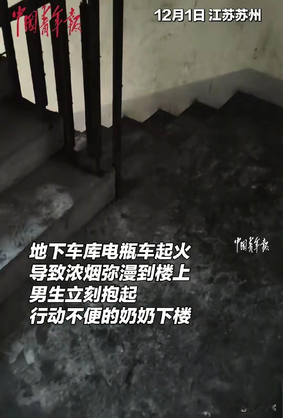 这孙子太厉害了!地下室着火,瘦瘦的他一只手抱行动不便的奶奶,另一只手在浓烟中摸路,最终祖孙二人皆平安。连网友也忍不住赞叹:“死神也无法从你手中抢走奶奶。” 事情发生在12月1日的江苏苏州,因为地下室电瓶车起火,大火浓烟迅速燃起,通往楼上的通道更是被浓烟弥漫。 小伙子瘦瘦的,年龄不大,只有17岁,奶奶行动不便,但并没有很瘦小,至少应该有八九十斤。 看不到楼道,一只手必须要慢慢摸才能缓慢通过,很难想象,如此瘦弱的孙子,究竟用了多大力气才一只手抱起奶奶。 这也印证了那句话,人在面对危险绝境时,爆发出来的潜力是无限的! 另有两个细节要注意: 一、起火是因为地下室的电动车,这再次给我敲响了警钟,购买、骑行、充电、停放都要合乎规范,防范于未然。 二、奶奶脸朝孙子怀里没啥大事,孙子吸入烟雾过尘得了轻微肺炎,这说明火灾发生时,除了大火高温威胁,另一个较为致命的是有毒浓烟,被困者一定要用湿毛巾捂好口鼻,减少吸入,万不可大意! 【来源:中国青年报】