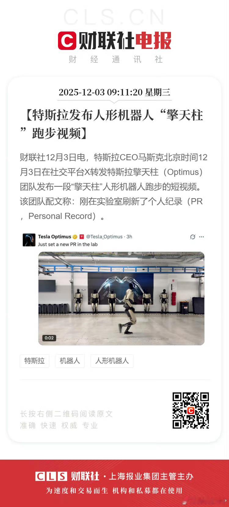 特斯拉发布人形机器人跑步视频 在人形机器人的竞争上,目前中美排头部。马斯克这个主要集中发展C端,我们这边集中发展在B端。考虑到马斯克的科技人设属性,不管擎天柱发展到哪步了,对特斯拉股价都是利好。