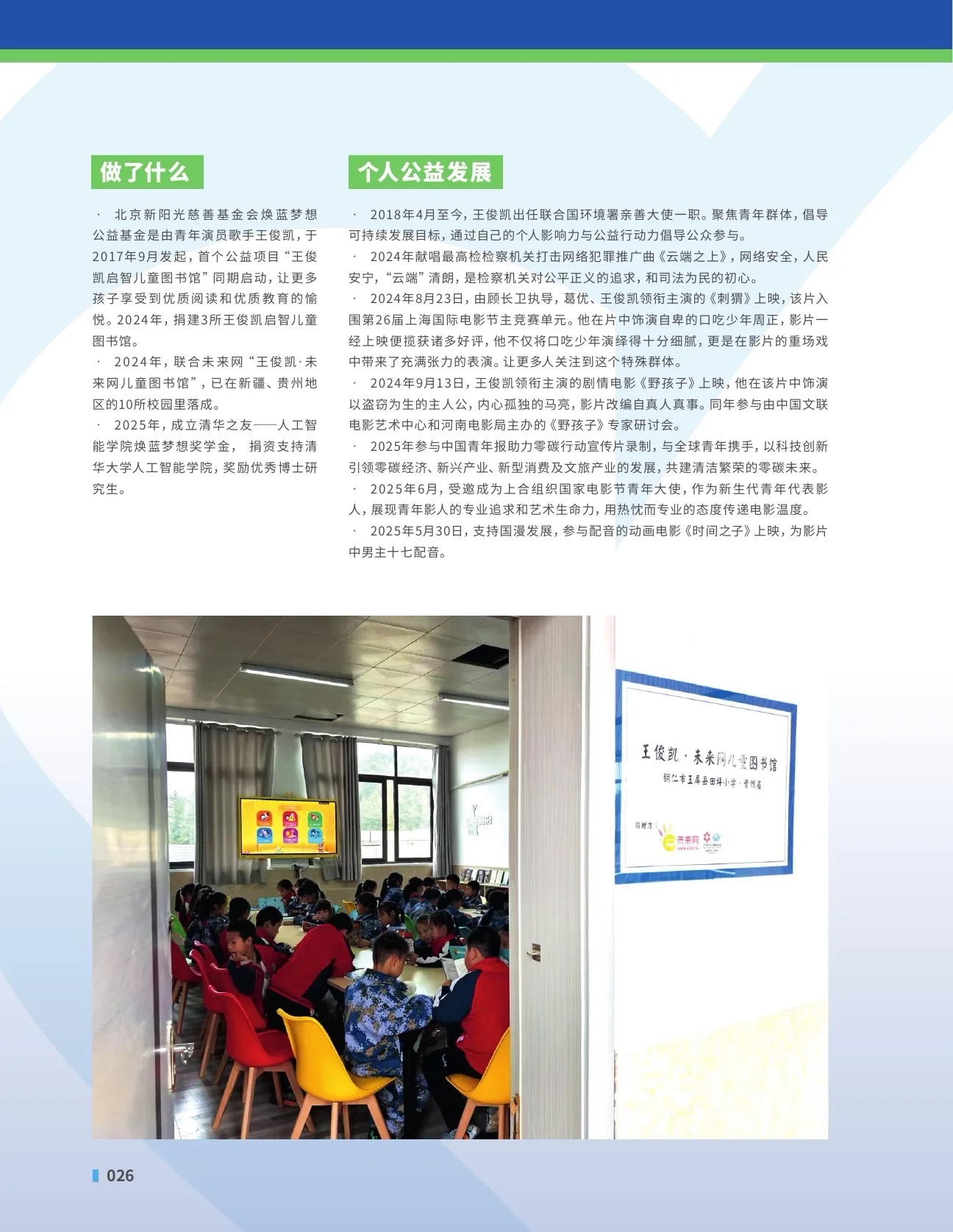 王俊凯被收录年度明星公益优秀案例王俊凯×北京新阳光慈善基金会×焕蓝梦想基金被收录年度明星公益优秀案例!从儿童智能图书室到清华之友人工智能学院奖学金,呈现出明星个人公益从“做一本书架"到“点亮一条成长路径”的成长与变化