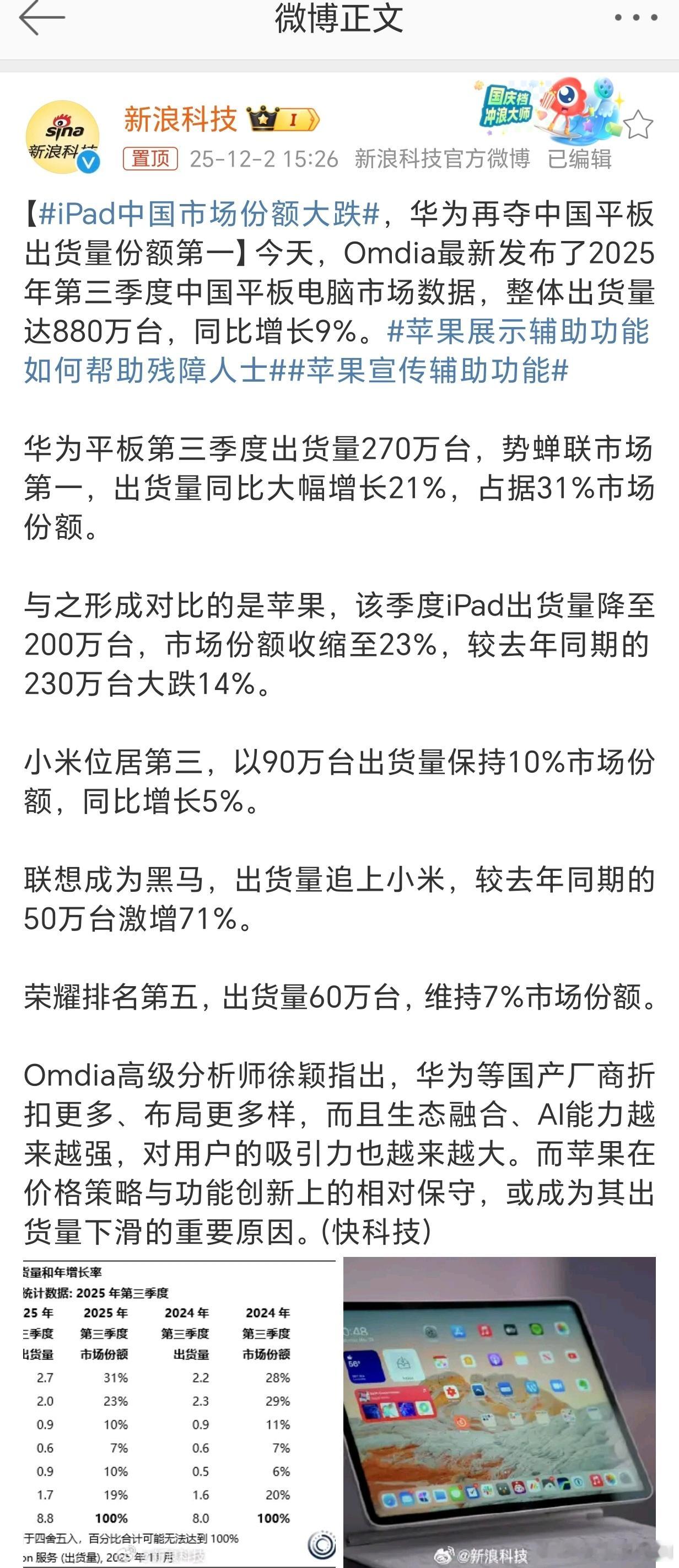 iPad中国市场份额大跌 苹果平板挺好,但价格属实贵的一批,还不像MacBook那样生产力优势够大。毕竟平板这玩意嘛,大部分人拿着它,平时就看看电影追剧,还有学生上课啥的,鸿蒙生态用着足够了。尤其是华为,全面普及云晰柔光屏的概念之后,各种2000多3000多的新品,都能在户外防眩光了,那真是谁看了都说好