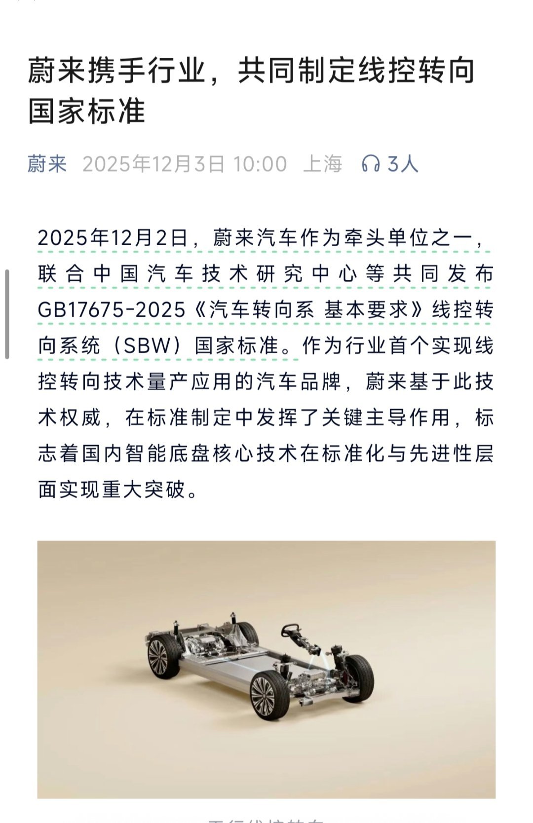 只有首个或者说最优秀的才能从制造者转为参与评定标准!蔚来携手行业,共同制定线控转向国家标准线控转向