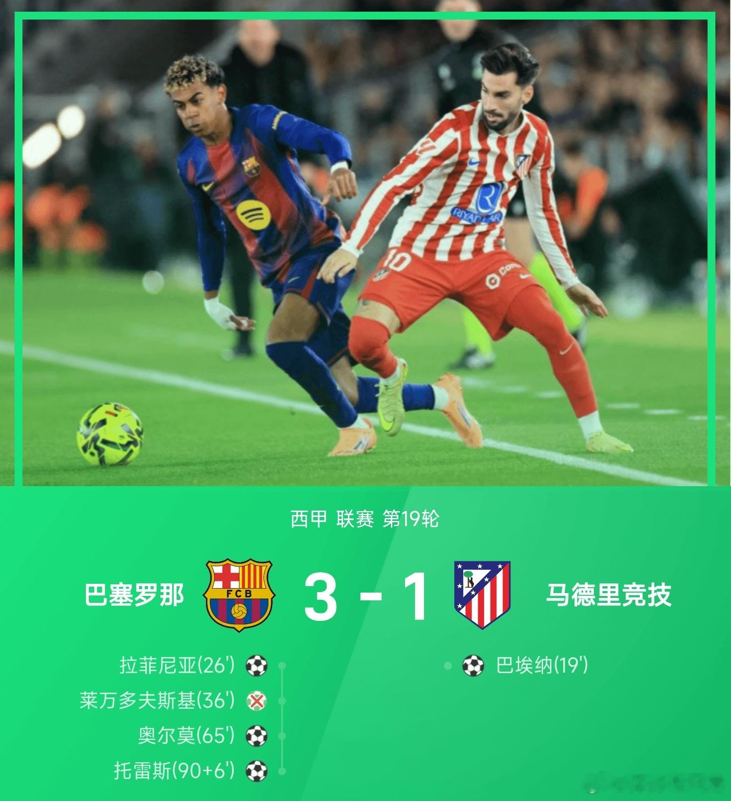 巴萨3比1马竞 巴塞罗那坐镇诺坎普球场迎战马德里竞技。此役上半场,巴埃纳接应传球突入禁区单刀破门,拉菲尼亚接应直塞晃过门将推空门得分,奥尔莫造点但莱万多夫斯基将点球踢飞。易边再战,奥尔莫禁区中路接球随即左脚抽射破门,托雷斯补时阶段再入一球。全场比赛结束,巴塞罗那3-1逆转马德里竞技,继续领跑积分榜。
