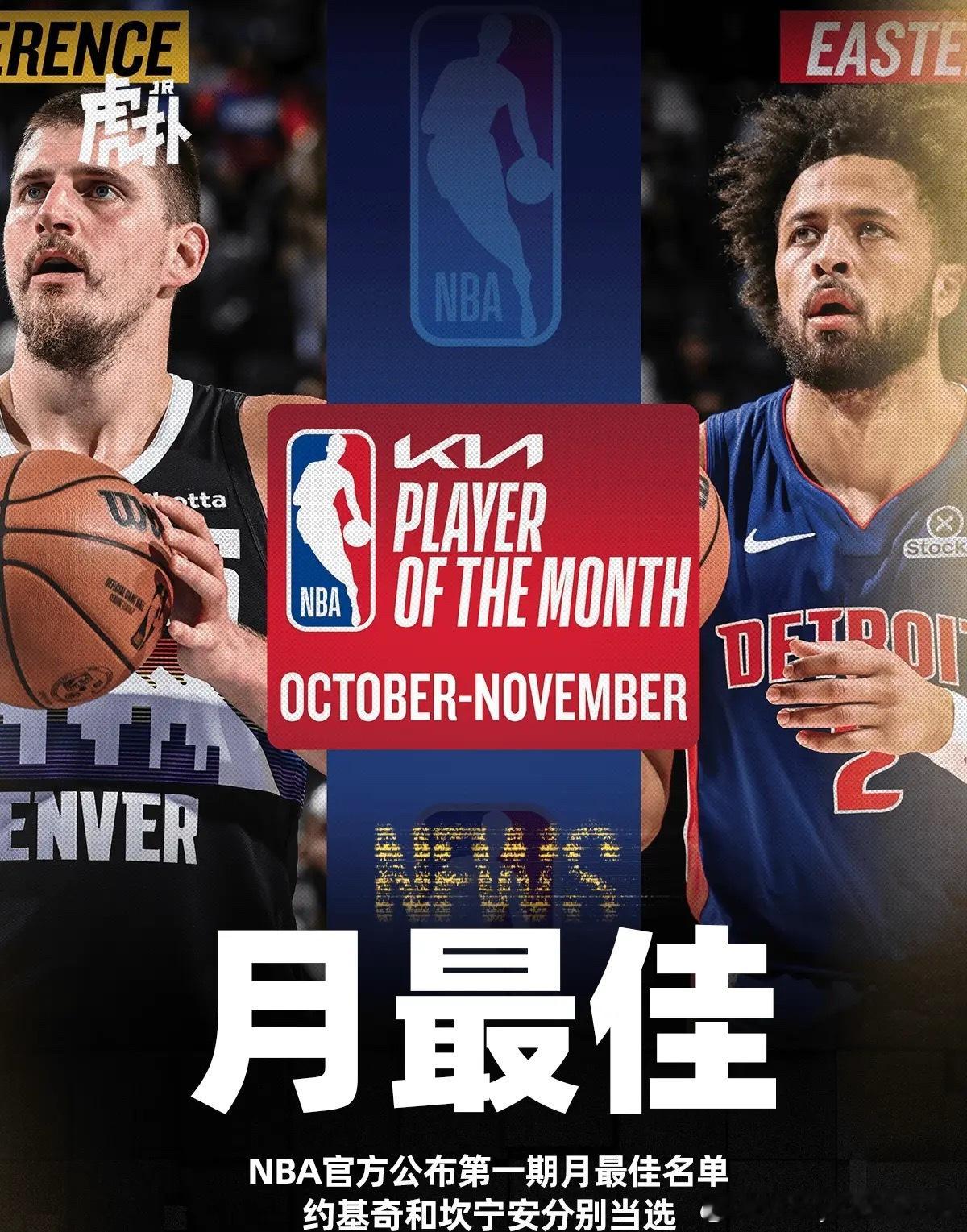 NBA官方公布10-11月最佳球员:西部约基奇,东部坎宁安约基奇场均28.9分12.4篮板10.9助攻,球队14胜5负。坎宁安场均28.8分6.4篮板9.4助攻,球队16胜4负