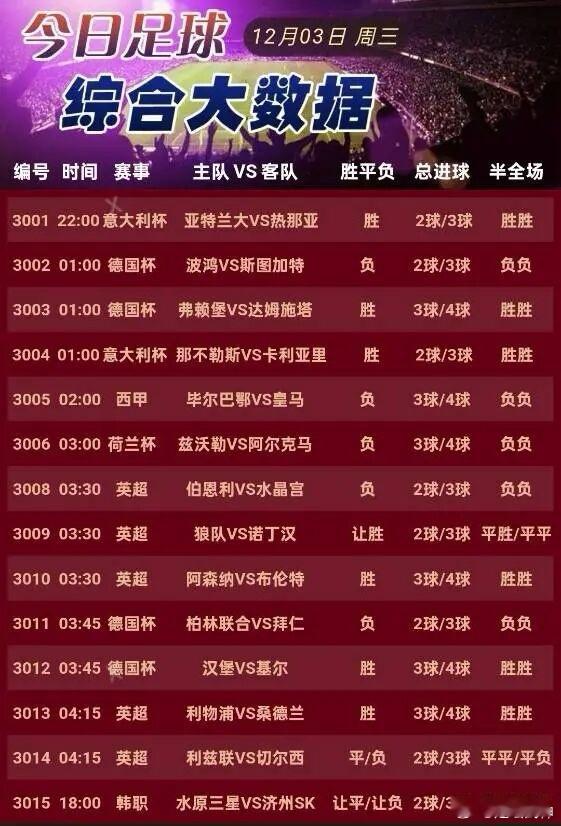 12月3日001 亚特兰大Vs 热那亚002 波鸿Vs 斯图加特003 弗赖堡VS 达姆施塔特004 那不勒斯VS 卡利亚里005 毕尔巴鄂竞技 VS 皇马 006 兹沃勒 VS 阿尔克马尔007 布莱顿VS 阿斯顿维拉
