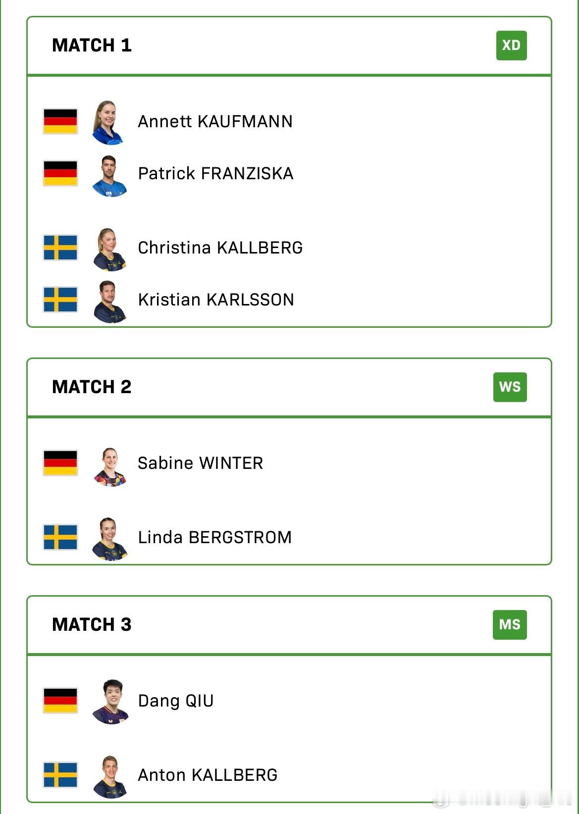 2025成都混合团体世界杯 第二阶段🇩🇪德国🆚瑞典🇸🇪考夫蔓/弗朗西斯卡🆚卡尔森/C·卡尔伯格沙宾·温特🆚琳达·伯格斯特隆邱党🆚安东·卡尔伯格