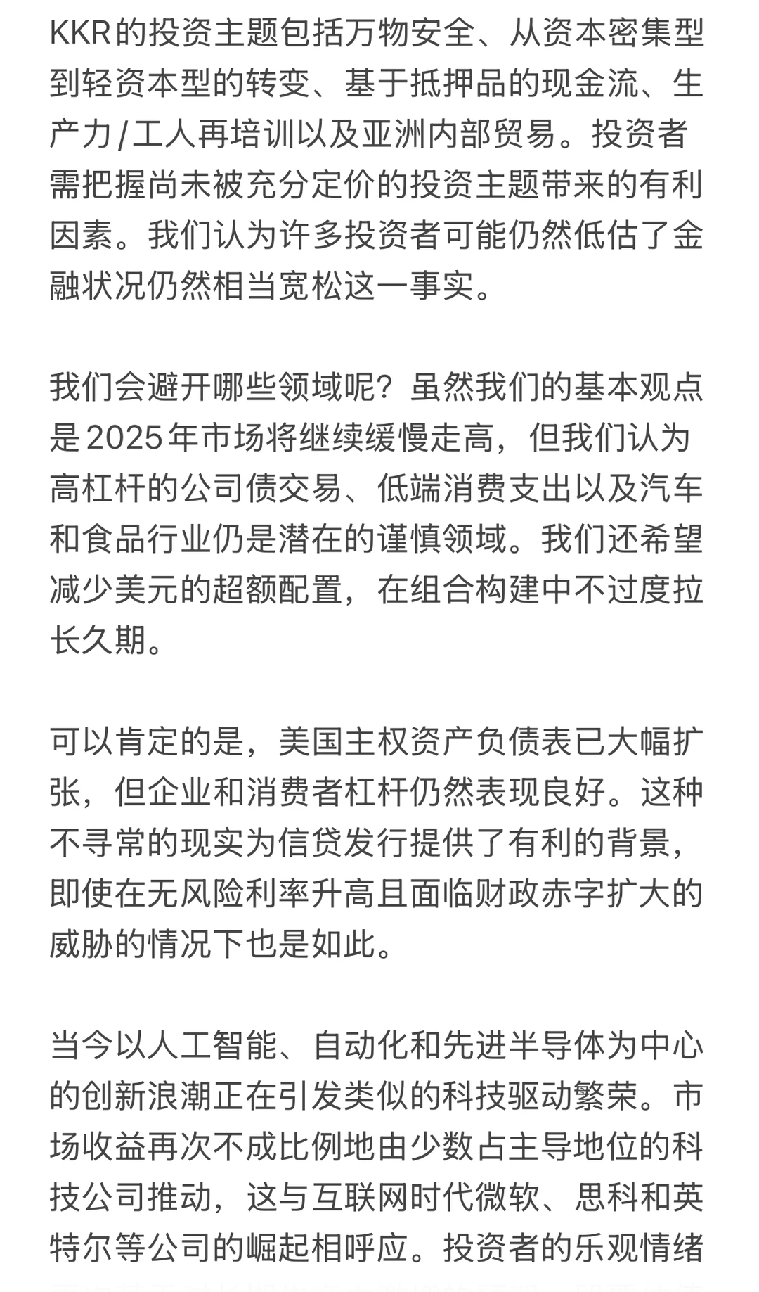 KKR 2025年的年中展望,今年写的有点杂乱了,看起来有点费劲,抽取一些核心信息放在图里了,同学们可以看看,看宏观这方面KKR还是有点东西的。