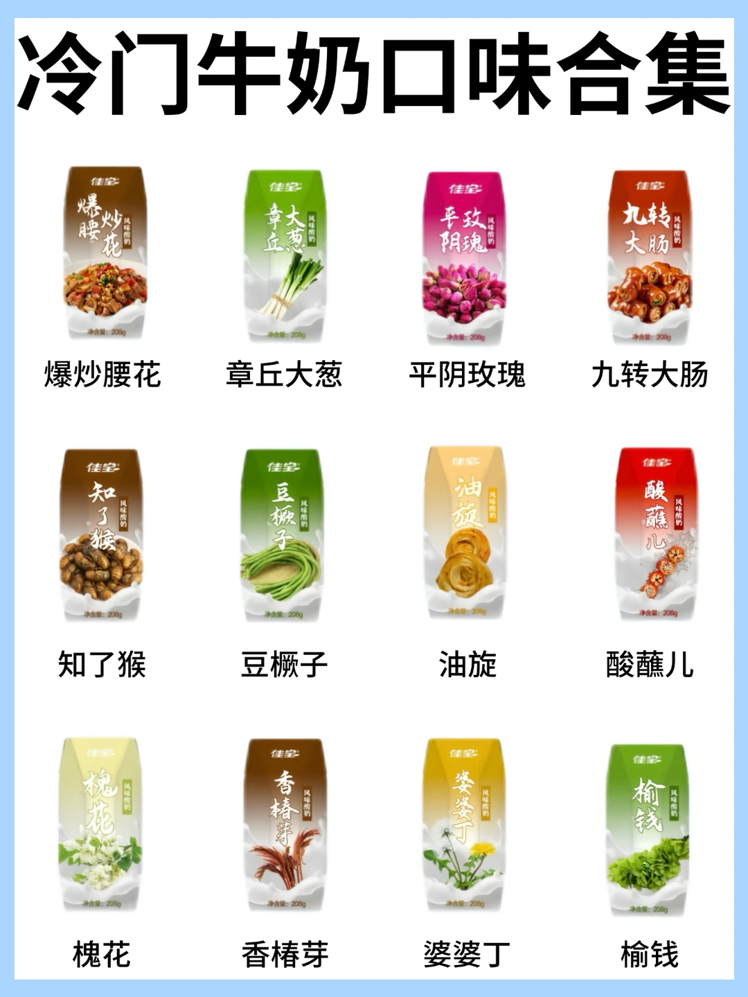 🤩这些牛奶口味太神奇了!给大家整理了一期冷门牛奶口味合集🔥每个都想尝尝🤣好好奇是什么味道‼️有没有你们喝过的❓喜欢猎奇口味的快收藏~ 蜜汁糖藕 桂花汤圆 鸭血粉丝 南京烤鸭 香菜口味 麻辣火锅口味 折耳根 花椒口味 麻酱凉皮 蜜枣甑糕 荞面饸饹 羊肉泡馍 苦瓜口味 韭菜口味 天津炸糕 苦水玫瑰 柿子味 榴莲芥末味 冰糖山楂 辣糊糊 腊汁肉夹馍 油泼辣子 把子肉 荷花芙蓉李 爆炒腰花 知了猴 平阴玫瑰 九转大肠 豆橛子 油旋 酸蘸儿 槐花 香椿芽 婆婆丁 榆钱 喜欢💕请多多点赞,感谢支持~