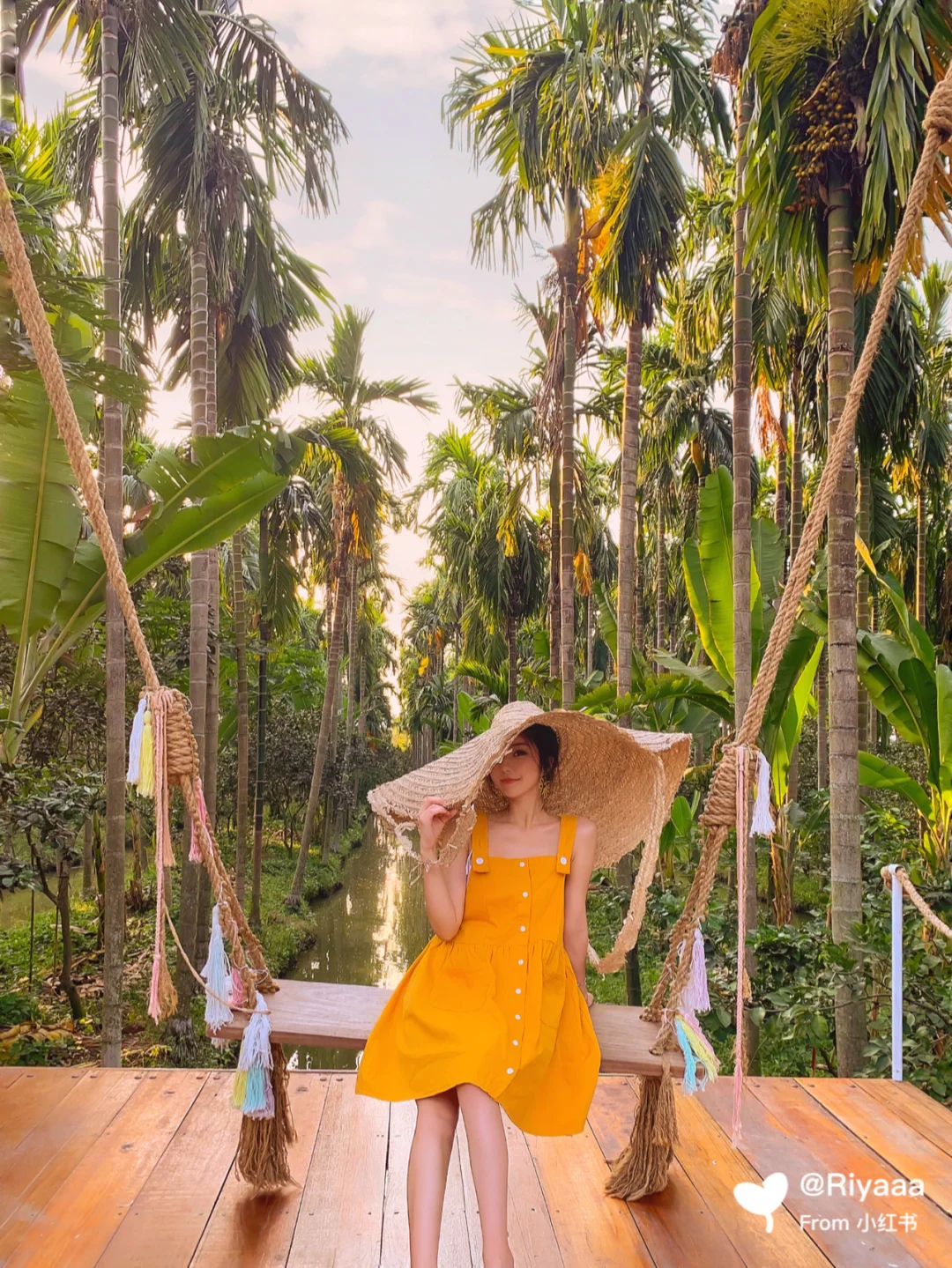 店铺里面有一块是榻榻米的座位,沿着榻榻米旁边的小楼梯上去有个秋千可以荡,店里还准备了草帽可以摆拍作为装饰~以热带雨林背景拍出来非常有度假的感觉