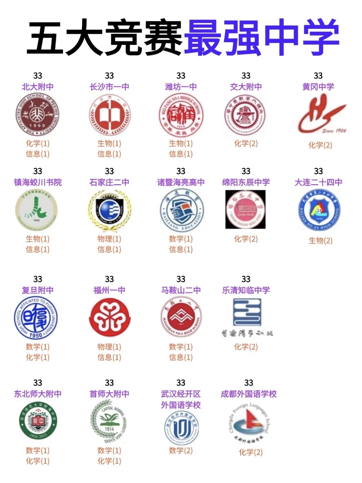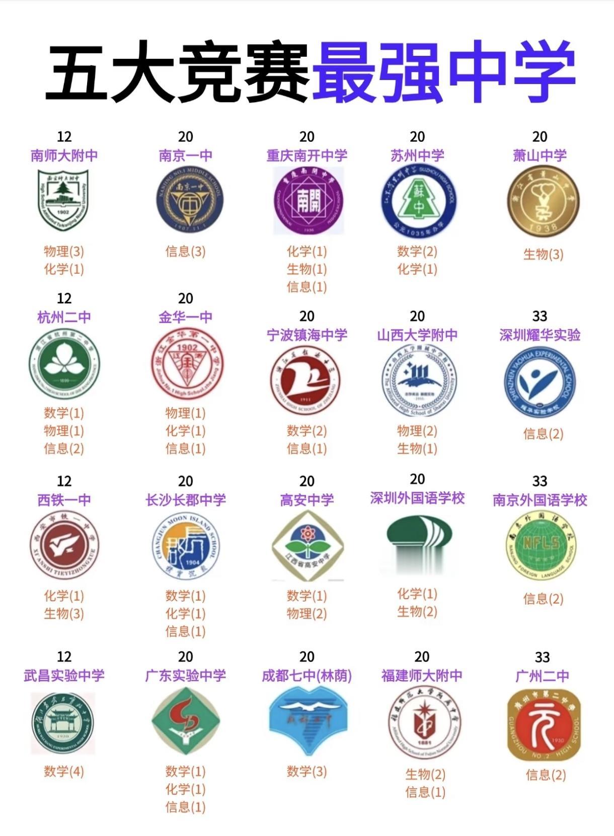 五大学科竞赛哪家强?人大附,上中,深中,巴蜀中学,成都七中,长郡,南外,杭二......这些如雷贯耳的中学,五大学科竞赛到底哪家更强一些? 从图片来看,排名靠前的头部学校:重庆巴蜀中学、上海中学、人大附中、华东师大二附中、深圳中学等。 具有区域竞争力的学校:成都七中、长沙雅礼中学、温州中学、华师一附中、杭州学军中学等。 其他参与竞争的学校:南京一中、重庆南开中学、苏州中学、萧山中学、杭州二中、深圳耀华实验、南京外国语学校等众多学校。 从整体来看,这些学校在五大竞赛领域的表现呈现出以下特点: 1,地域分布广泛:覆盖了全国多个省市,包括直辖市、省会城市以及一些教育强市,不同区域在中学学科竞赛培养上都做了不少投入,中学学科竞赛教育的地域多样性得到了体现。 2,学科优势各有侧重:不同学校在数学、物理、化学、生物、信息五大竞赛学科上各有擅长,有的学校在多个学科均有突出表现,有的学校则在特定学科领域形成优势,呈现出学科发展的差异化格局,这既与学校的师资配置、教学资源倾斜有关,也与学校长期形成的竞赛培养传统相关。像湖北主打物理数学,湖南主打生物信息学,海南异军突起主打化学,上海主打数学等。 3,头部学校优势明显:以重庆巴蜀中学、上海中学、人大附中为代表的头部学校,在竞赛获奖数量和学科覆盖面上表现突出,形成了较强的品牌效应,这类学校往往具备成熟的竞赛培养体系、优质的师资团队和丰富的资源支持,在拔尖创新人才培养上处于领先地位。 需要说明的是,图片是2024年各学校入选国集的数据。2025年第一名应该是人大附中,王者归来。
