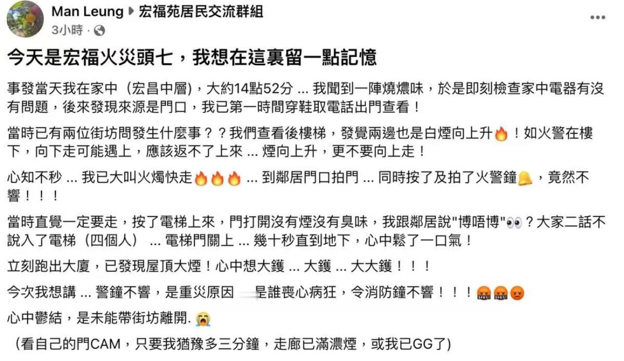 宏福苑起火之时,火警钟坏了是没跑的事实,就因为火警钟失灵,才导致这么多住户没能及时逃生。 有宏福苑幸存住户发文,在火灾前的8分钟,自己就闻到浓烟味道,出于警惕,自己还检查了下屋内的电器设备,结果发现浓烟是从门口传来的。 当时其他邻居同发生异样,在此情况下,这位住户特意拍了拍火警钟,结果发现根本不响,然后这位住户连同其他三个住户第一时间坐电梯逃到楼下,侥幸逃过这个大劫。 要不是提前闻到了烧焦的烟味,这几位住户应该也是在劫难逃,看来鼻子灵的人真的有优势。