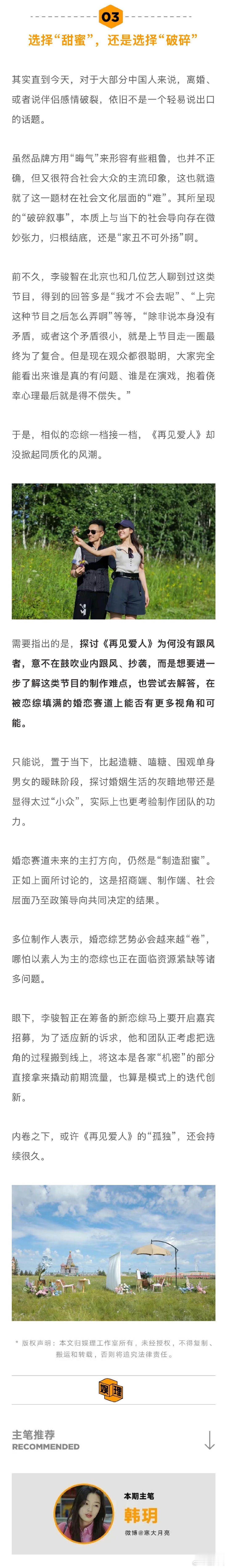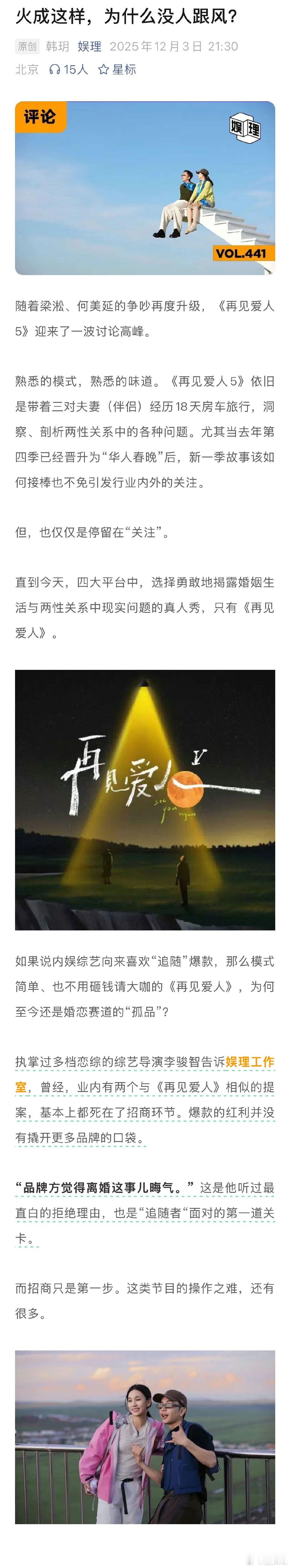 品牌方觉得离婚这事儿晦气 业内谈离婚综艺招商难 执掌过多档恋综的综艺导演李骏智告诉新浪娱乐工作室,业内曾有两个与《再见爱人》相似的提案,基本上都死在了招商环节, “品牌方觉得离婚这事儿晦气。” 尴尬的还有后续的商业转化。婚恋纪实综艺很难通过“售后CP”延续节目热度,实现例如带货直播、接代言等商业闭环。甚至越有话题度的人,越难以受到品牌青睐,几乎不会有观众因为节目中“鸡飞狗跳”的情节为嘉宾买单…娱理独家↓