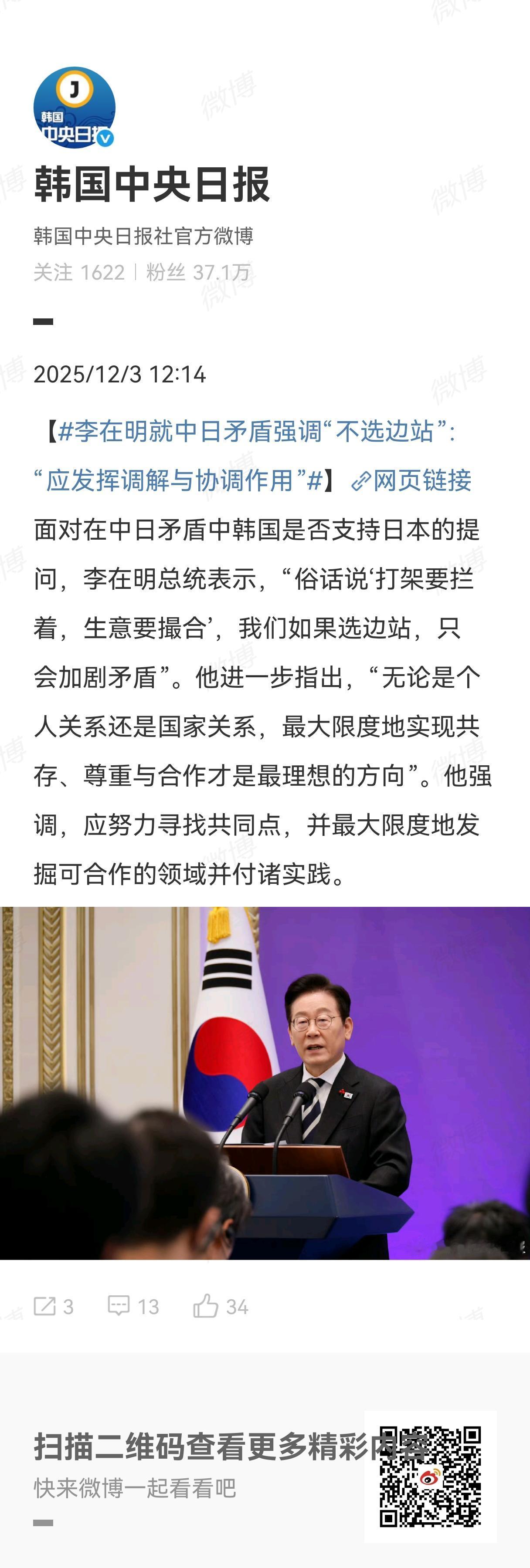 李在明近期对中日外交冲突的表态:俗话说打架要拦着,生意要撮合,我们如果选边站,只会加剧矛盾。无论是个人关系还是国家关系,最大限度地实现共存、尊重与合作才是最理想的方向。李在明的意思很明白,韩国不选边站。有人认为不选边站就是在选边站,没有谴责日本就是在支持日本。日韩都有美国驻军,本来能够自我发挥的空间有限,这种时候只要不是公开倒向日本,就是对我们的支持。况且还有一个美日韩同盟,韩国不公开站日本,本身表达了美日韩同盟盟友的态度,那就是我不得支持你,你的事情与我无关。